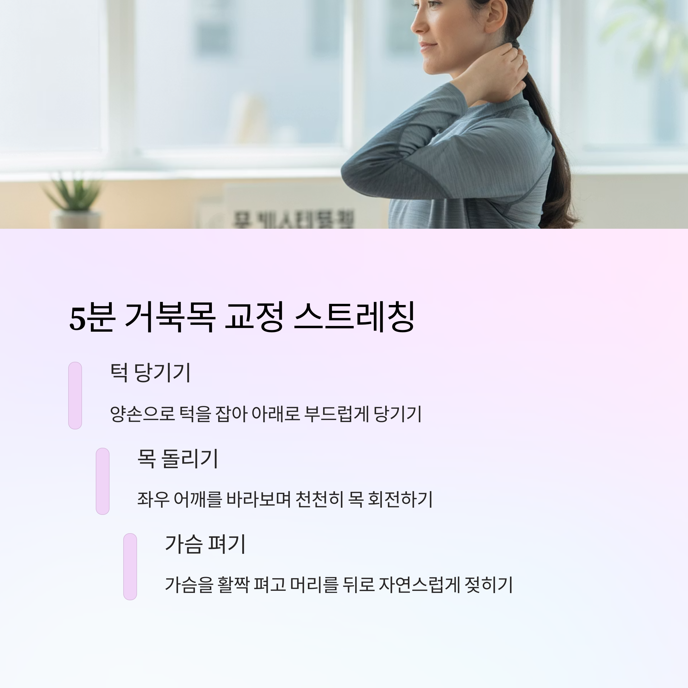장시간 자세 유지가 거북목을 심화시킵니다. 하루 3~5분씩 정기적으로 실천하는 것이 핵심입니다. 생활 습관 개선 없이는 효과를 보기 어렵습니다.