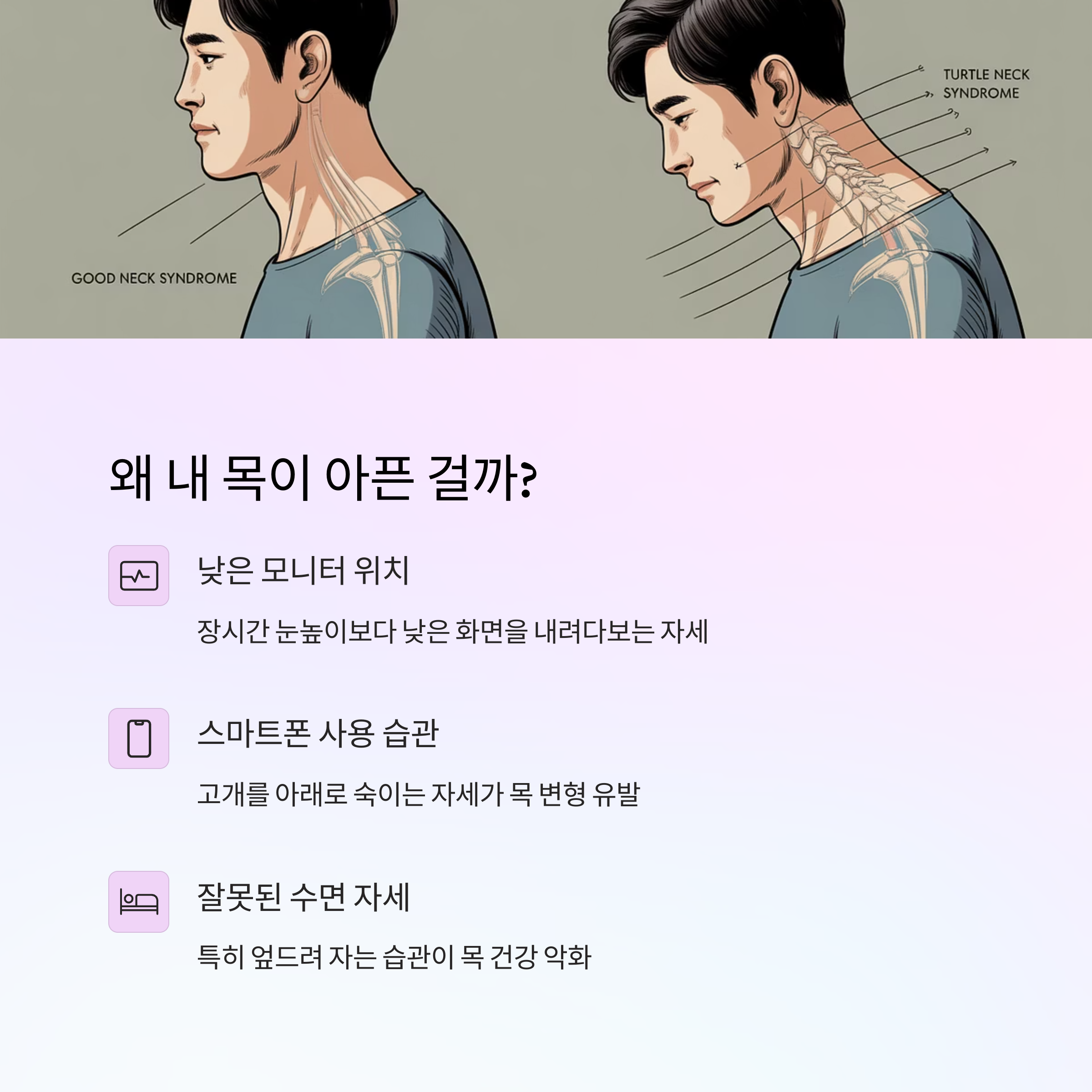 스마트폰 과사용, 잘못된 자세 등이 주요 원인입니다. 목 돌리기, 어깨 젖히기, 가슴 열기 스트레칭이 효과적입니다. 눈높이 유지, 바른 앉은 자세, 규칙적인 수면이 중요합니다.