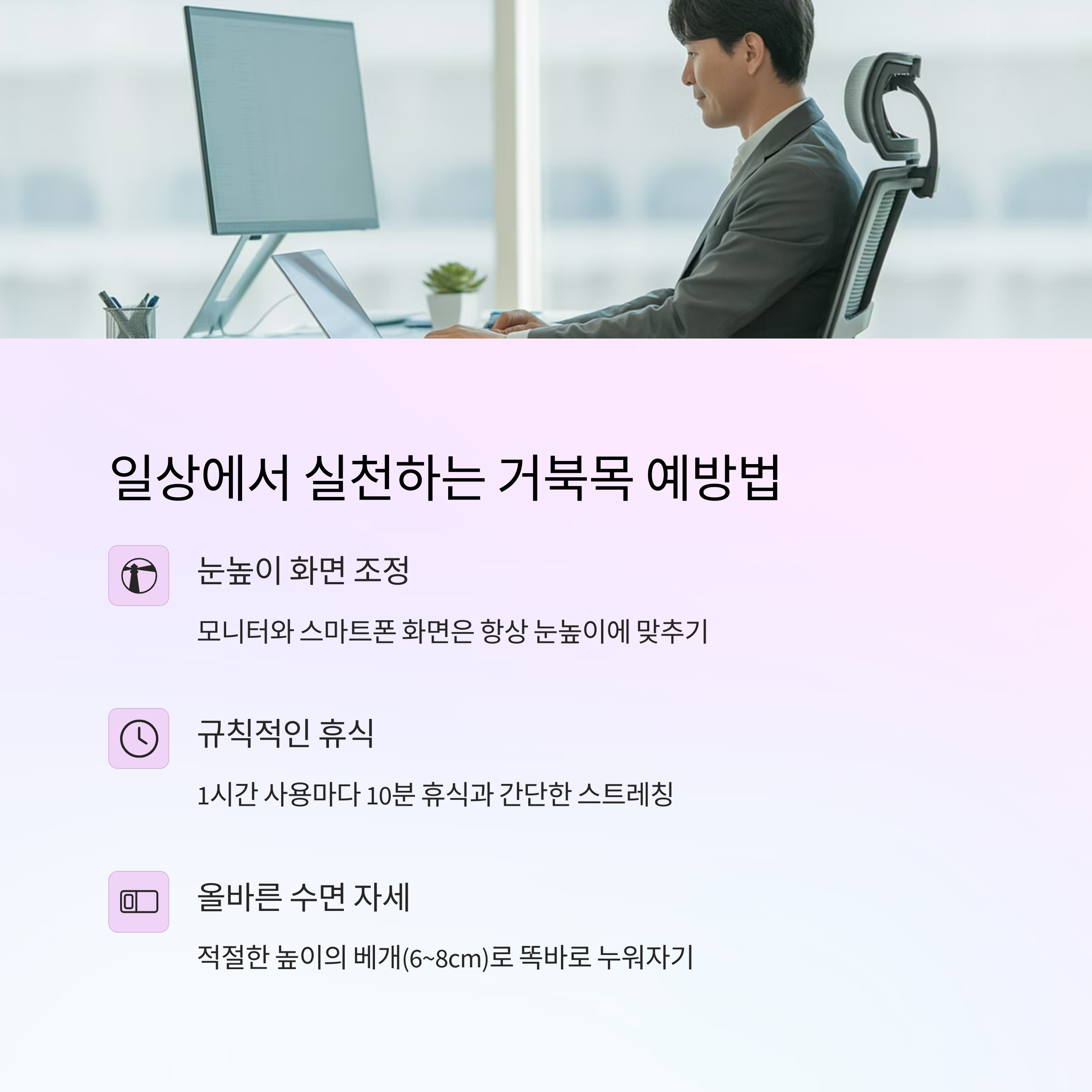| 스마트폰 과사용, 잘못된 자세 등이 주요 원인입니다. | 목 돌리기, 어깨 젖히기, 가슴 열기 스트레칭이 효과적입니다. | 눈높이 유지, 바른 앉은 자세, 규칙적인 수면이 중요합니다. |