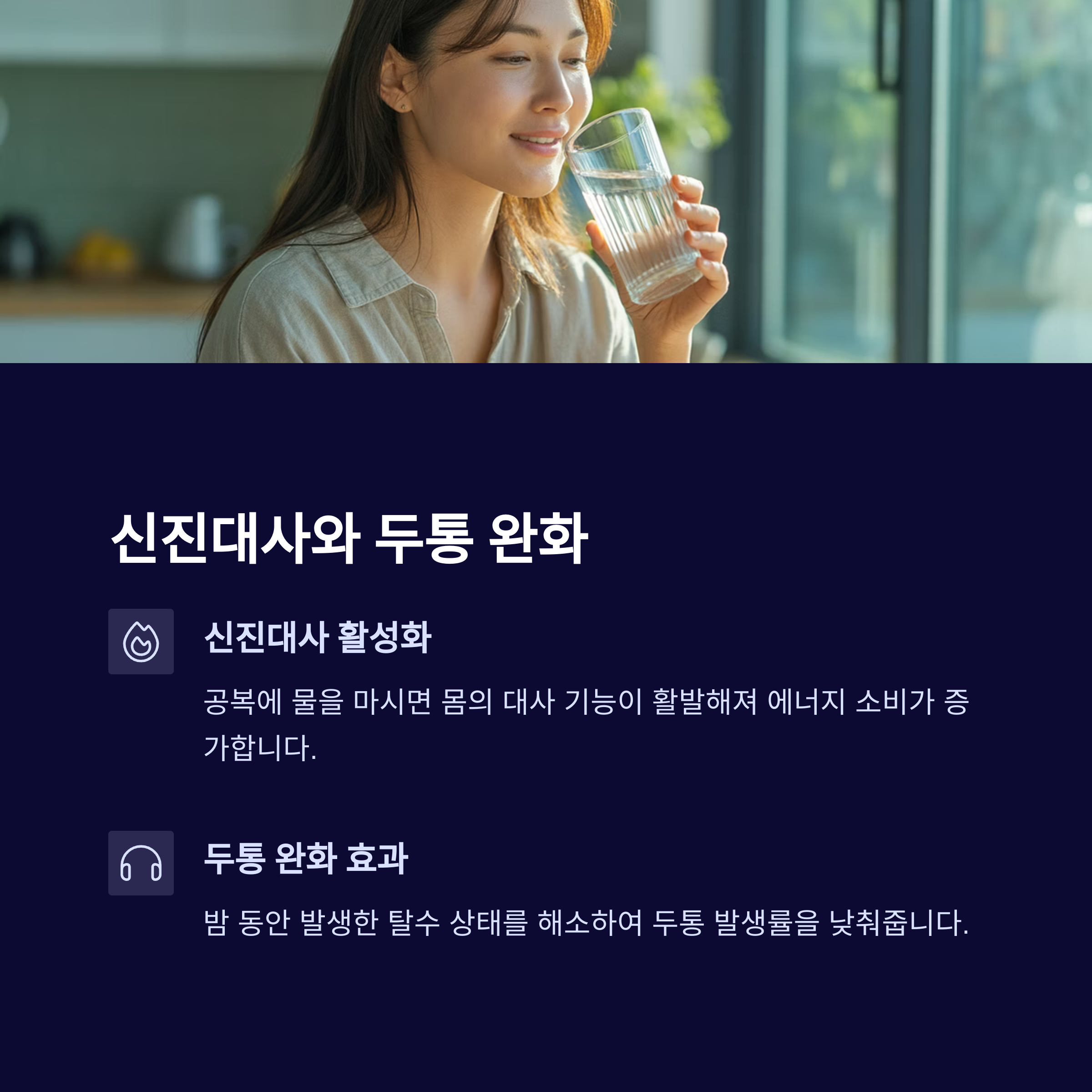| 아침 공복 시 수분 보충은 신진대사에 효과적입니다. | 성인은 1.5~2리터가 권장되며 꾸준한 섭취가 필요합니다. | 식전, 운동 전후, 수면 전 물 섭취 타이밍을 지키세요. |