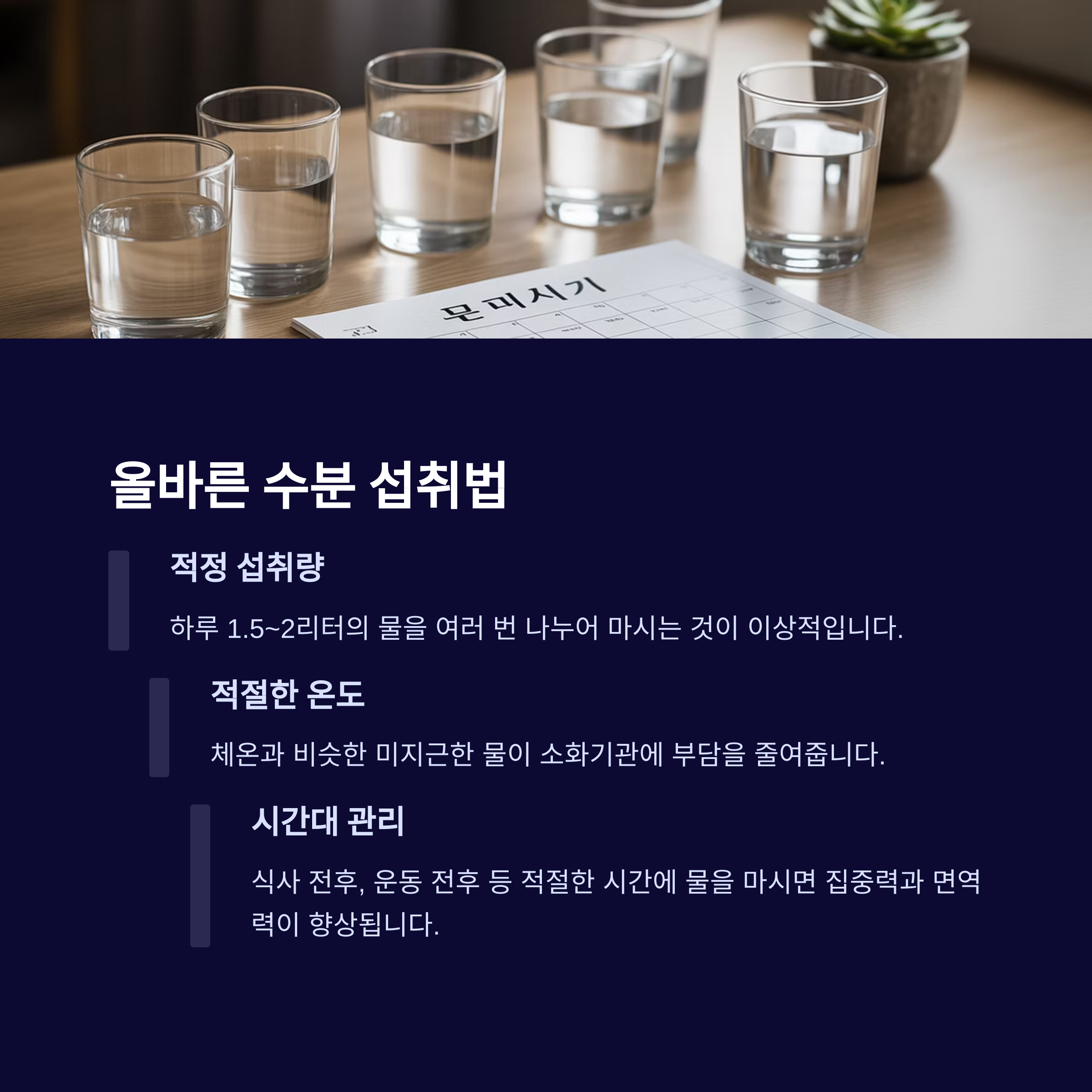 아침 공복 시 수분 보충은 신진대사에 효과적입니다. 성인은 1.5~2리터가 권장되며 꾸준한 섭취가 필요합니다. 식전, 운동 전후, 수면 전 물 섭취 타이밍을 지키세요.
