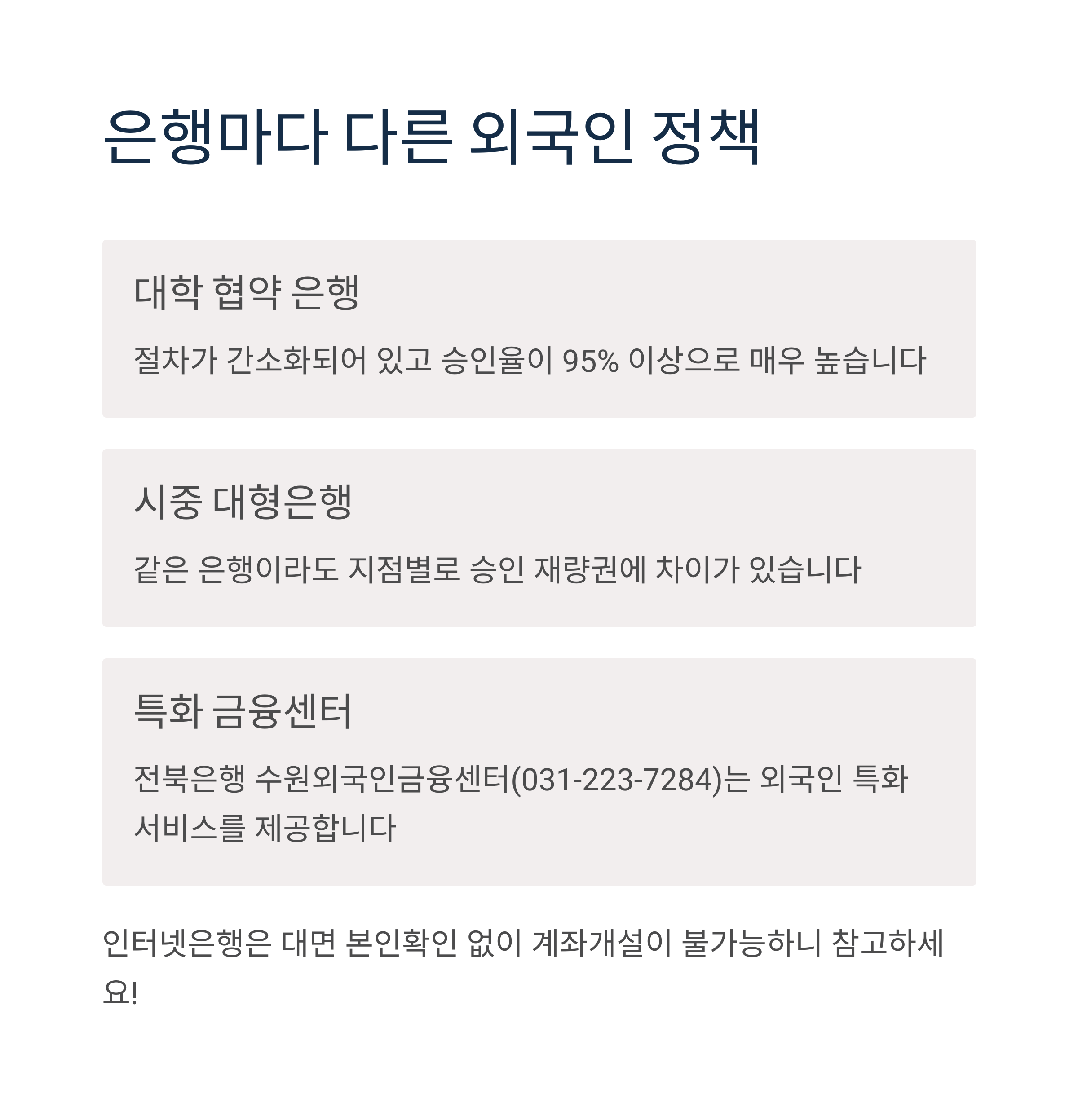 두 번째로 중요했던 점은 '은행별 정책 차이'였습니다. A은행은 외국인 학생에게 매우 보수적인 반면, B은행은 오히려 계좌 개설에 협조적이었습니다. 결국 학교 근처 커뮤니티에서 추천받은 은행으로 찾아가, 필요한 서류를 정비해 재도전한 끝에 성공적으로 계좌를 만들 수 있었습니다. 은행 선택이 계좌 개설의 절반입니다. 사전 조사와 추천이 중요합니다.