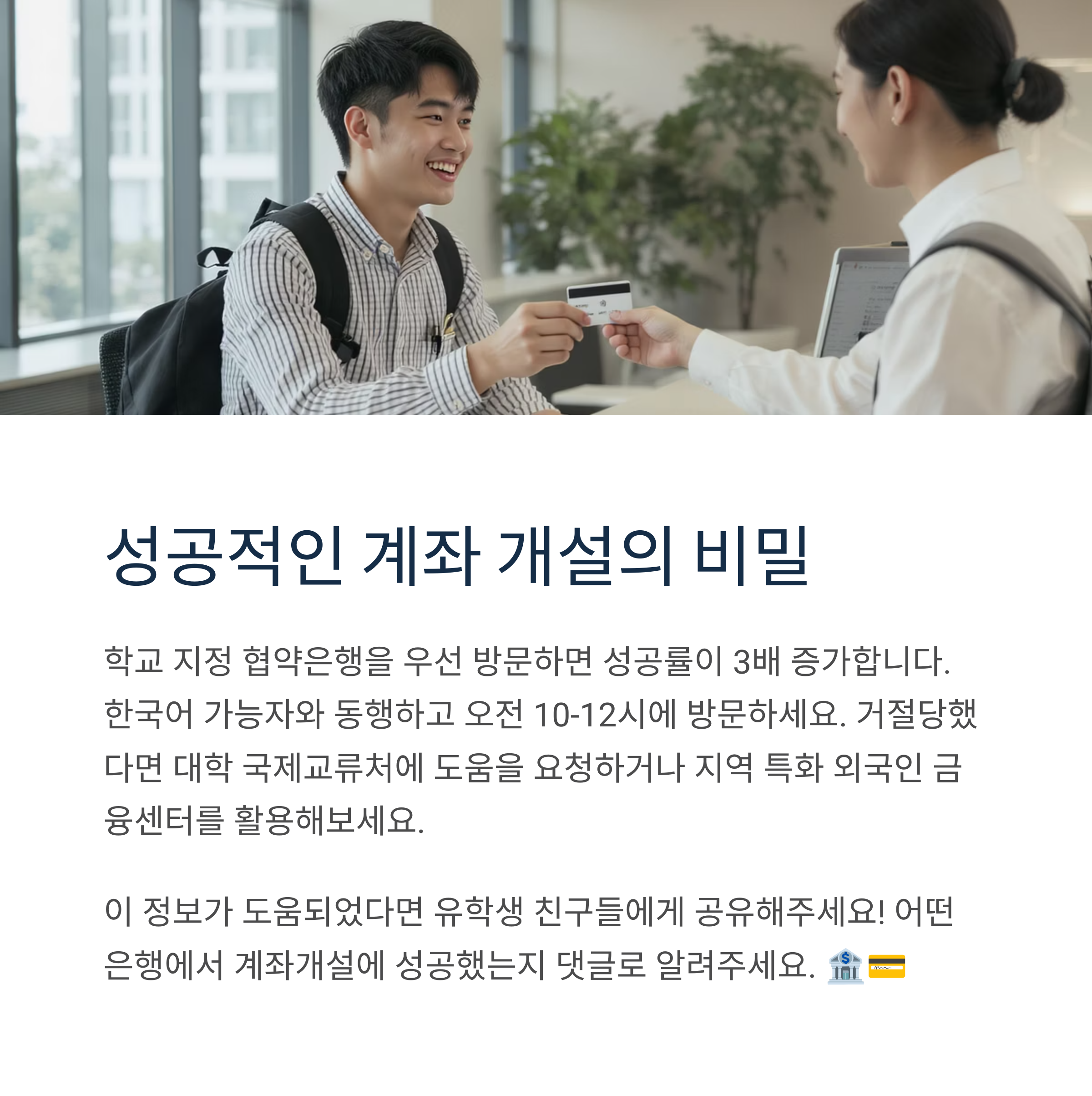 유학생활 중 계좌 개설에 어려움을 겪으신 경험이 있으신가요? 또는 다른 팁이 있다면 댓글로 공유해주세요. 여러분의 경험이 또 다른 누군가에게 큰 도움이 됩니다!