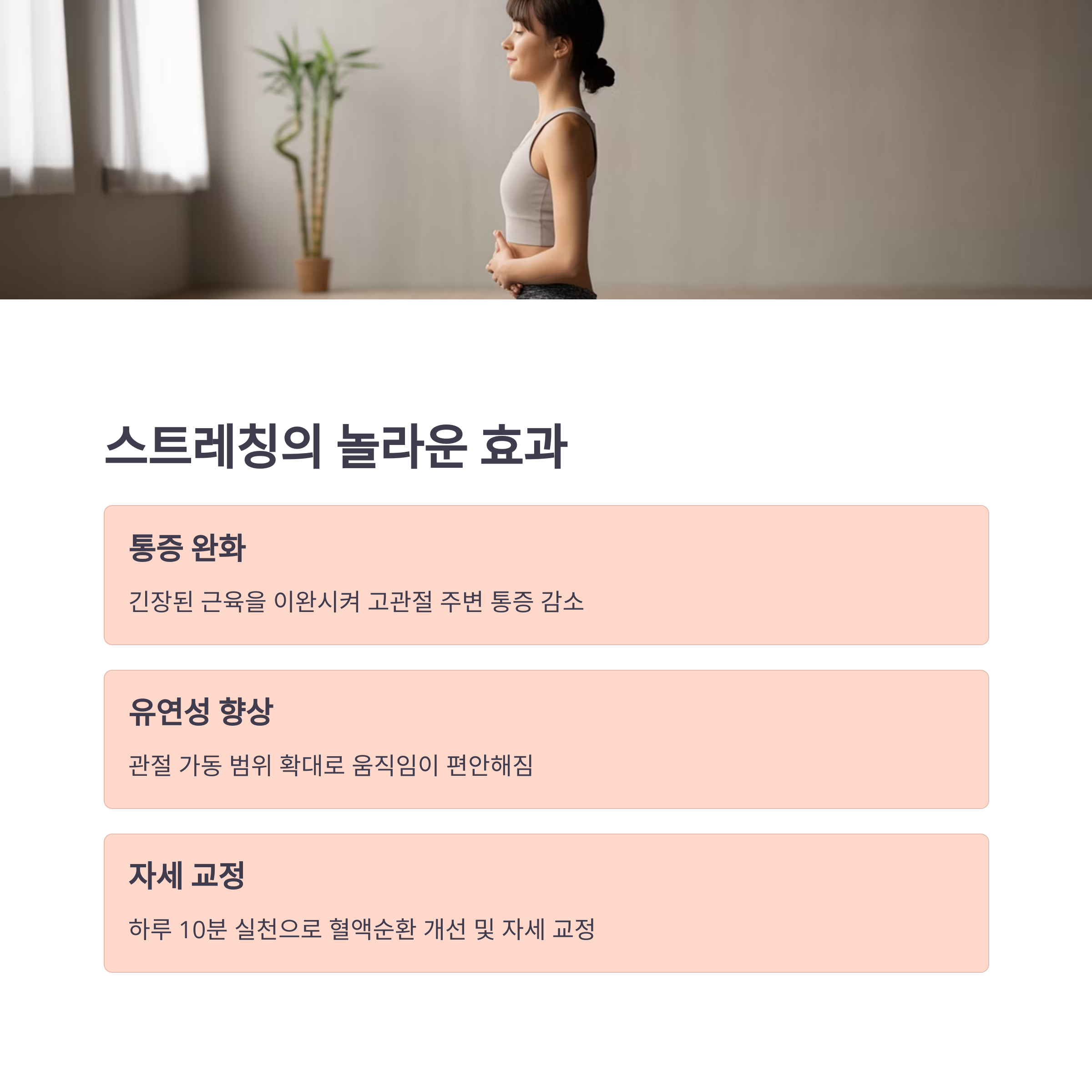 | 바른 자세 유지와 스트레칭 병행이 핵심입니다. | 아침과 자기 전 10분씩 꾸준히 실천해보세요. | 약물 없이도 자연치유력을 높일 수 있습니다. |
