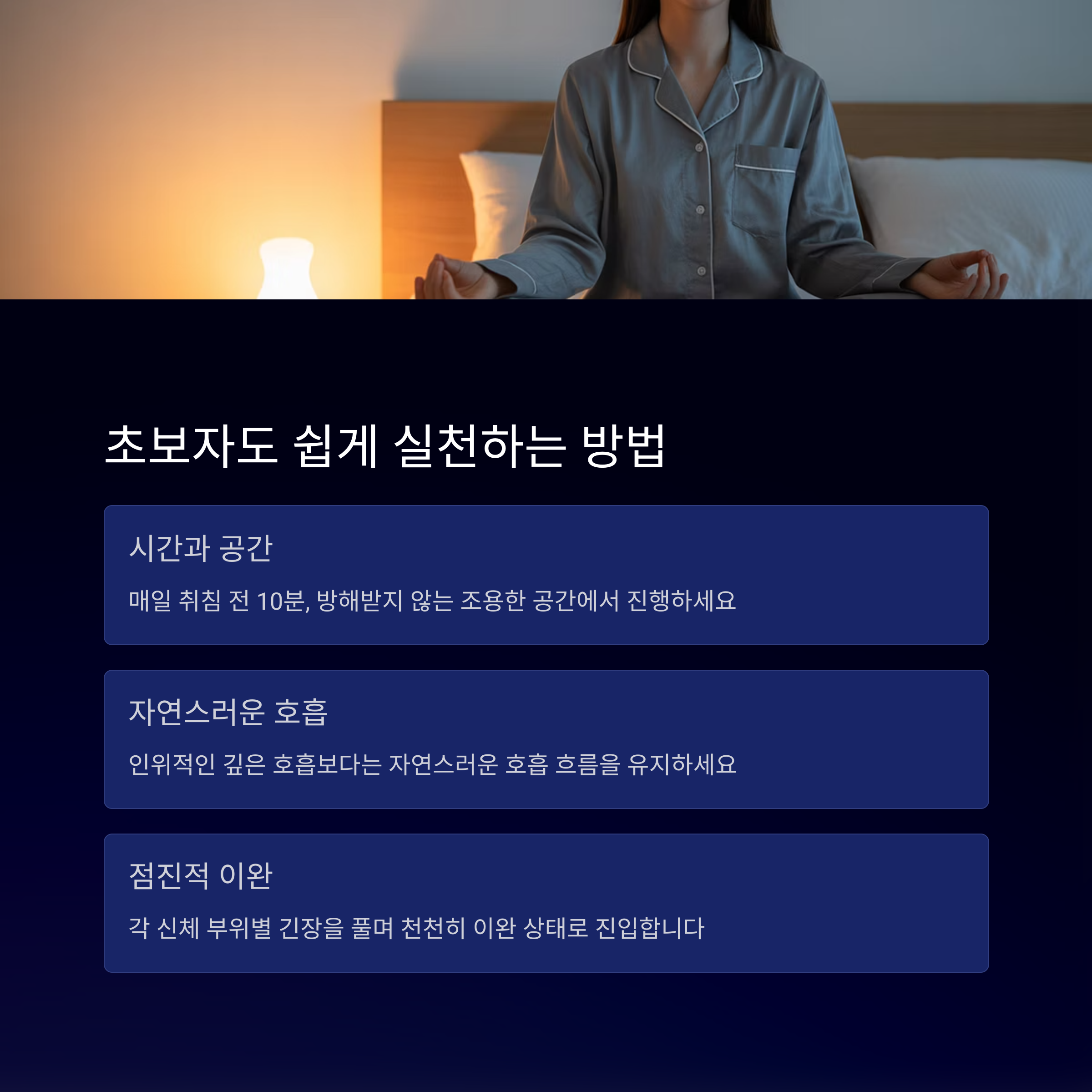 수면 명상은 다양한 방법이 있습니다. 그중에서도 가장 대중적인 방식은 '바디 스캔 명상'입니다. 발끝부터 머리까지 차례로 몸의 감각을 인지하며 긴장을 풀어주는 이 방법은 실제 임상 심리치료에도 사용될 만큼 효과가 검증되어 있습니다. 숨을 들이쉴 때마다 새로운 에너지가 몸에 채워지고, 내쉴 때마다 불필요한 긴장이 빠져나간다고 상상해 보세요. 뇌는 이러한 이미지와 상상을 현실처럼 인식하며, 몸은 실제로 이완되고 안정감을 느끼게 됩니다.