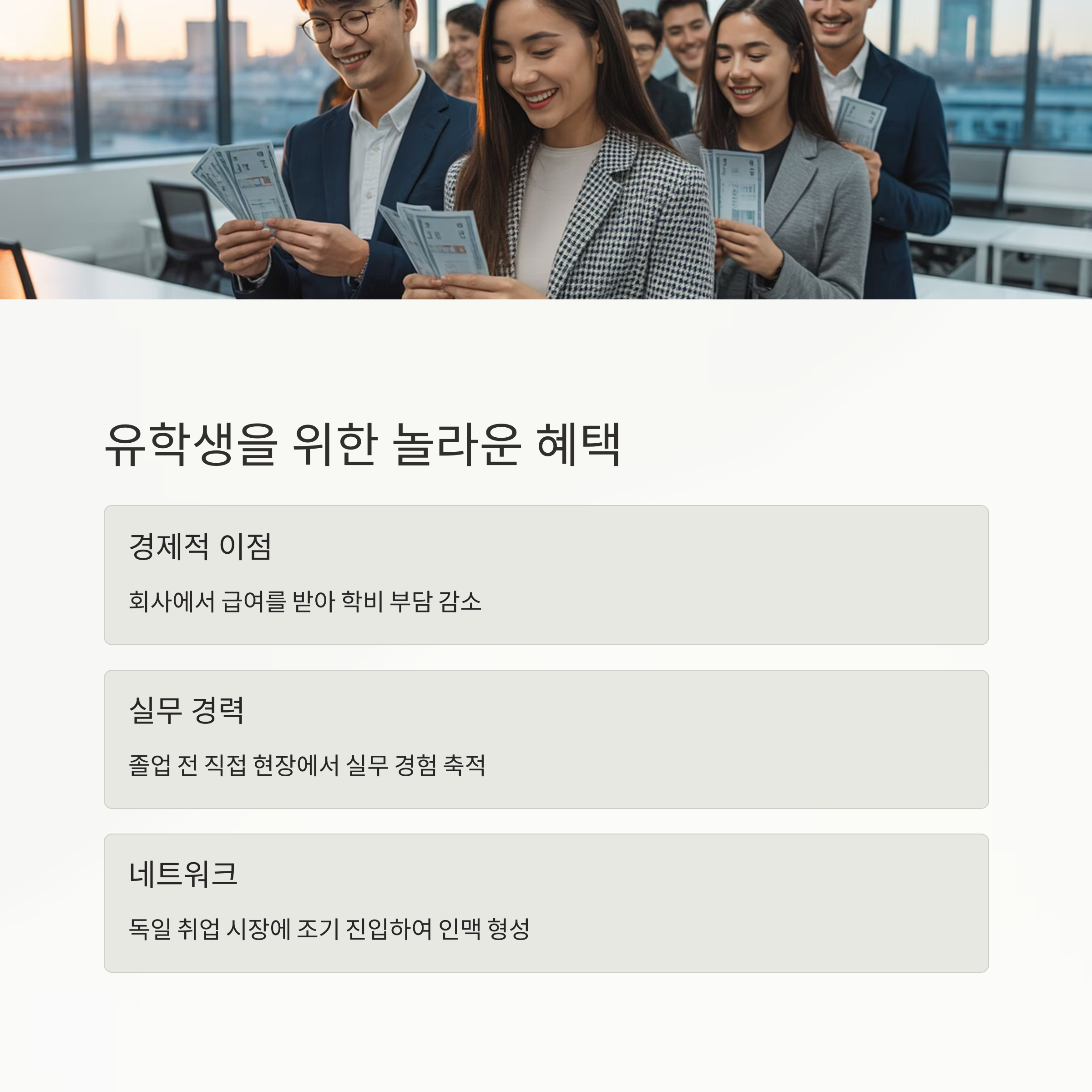 학생이 학기 중에는 학교에서 이론을 배우고, 방학 중에는 계약된 기업에서 급여를 받으며 실습을 수행하는 구조는 단지 경력을 쌓는 것 이상의 효과를 줍니다. 이를 통해 졸업 전부터 실무에 익숙해지며, 실제 채용 단계에서도 해당 기업의 요구를 정확히 파악할 수 있게 됩니다. 이러한 과정은 자연스럽게 독일 현지에서의 취업과 영주권 확보로도 이어질 수 있는 기반을 마련해 줍니다.