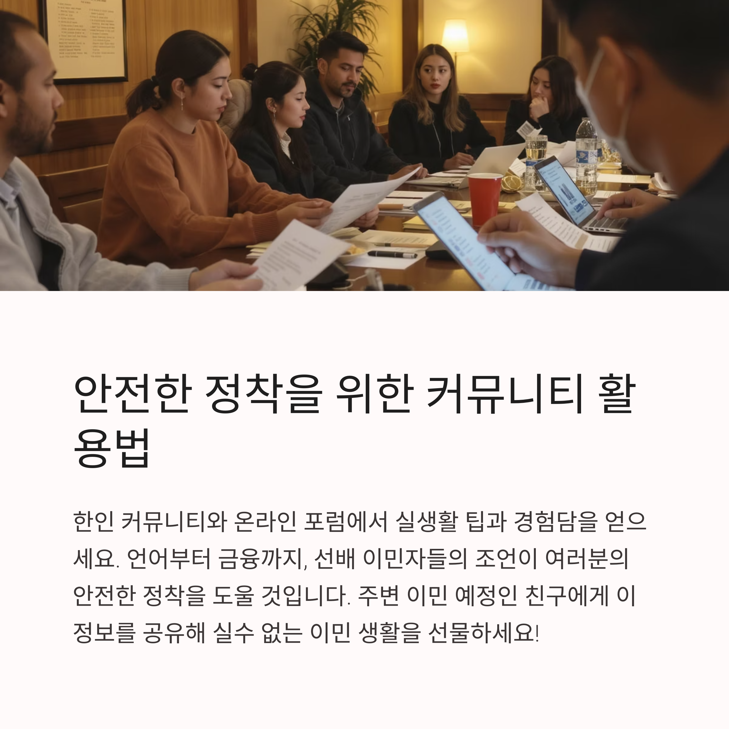 | 생활비, 주거비 등의 초기 자금 계획 필요 | 보험, 통신사, 렌트 계약 등 주의 필요 | 커뮤니티, 포럼을 통해 다양한 정보 수집 |