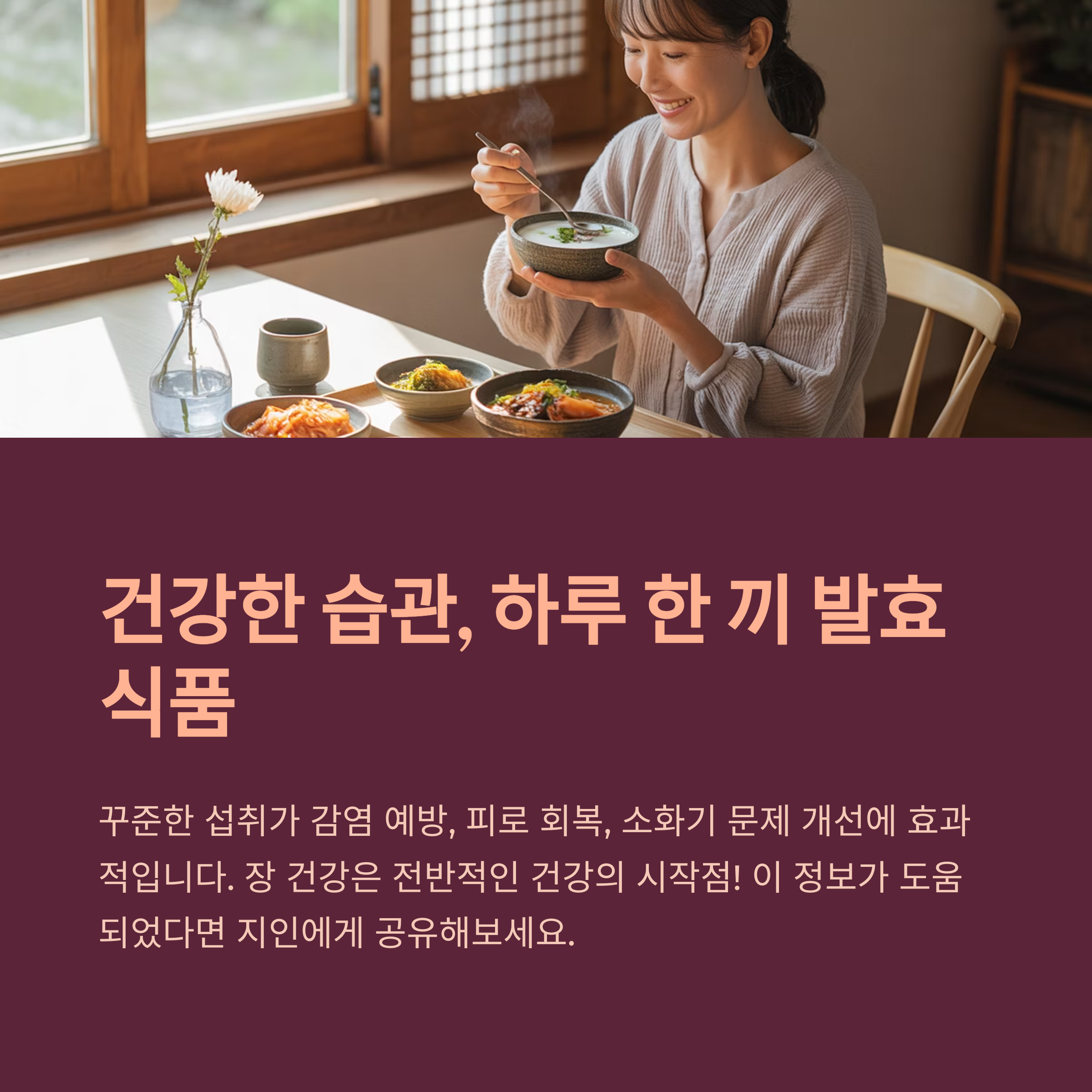 | 김치, 된장, 요구르트 등이 대표적입니다. | 정기적인 섭취가 장 기능 회복에 도움이 됩니다. | 우리 식탁에 늘 함께해 온 친숙한 건강 식품입니다. |