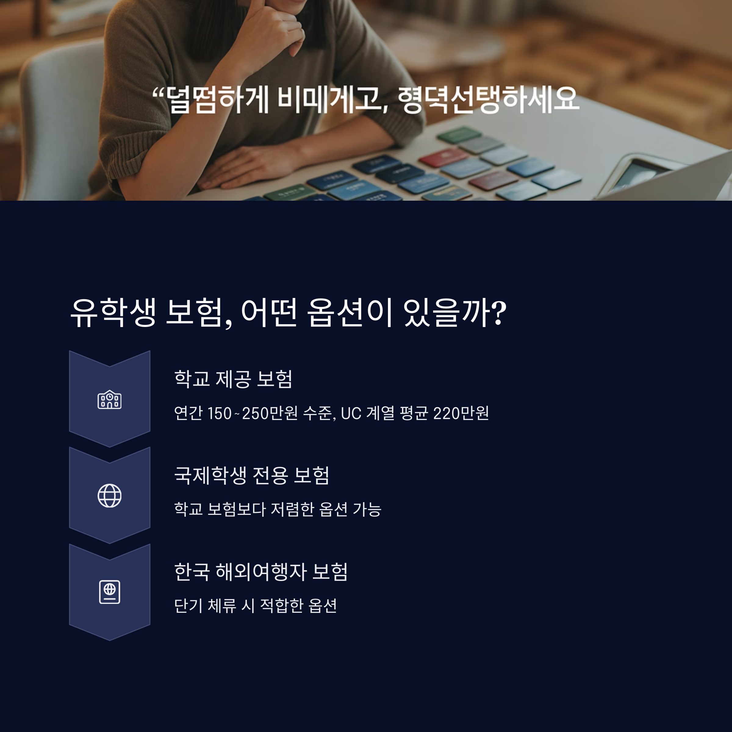 | 학교 제공 보험 | 국제학생 보험 | 해외여행자 보험 |