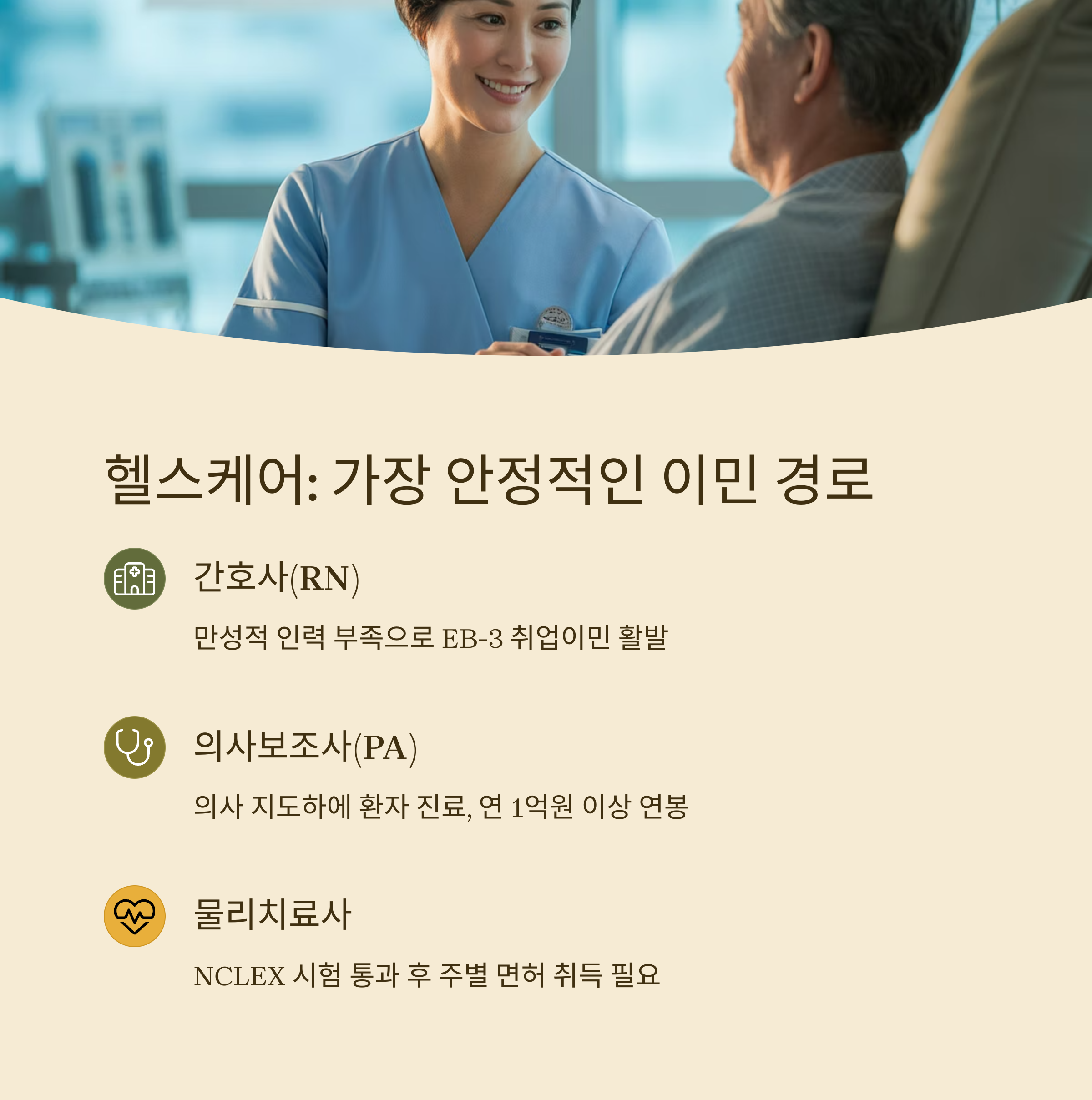 | 헬스케어, IT, 엔지니어링 등 | 학위, 자격, 스폰서 기업 필요 | 취업 기반 EB-2, EB-3 가능 |