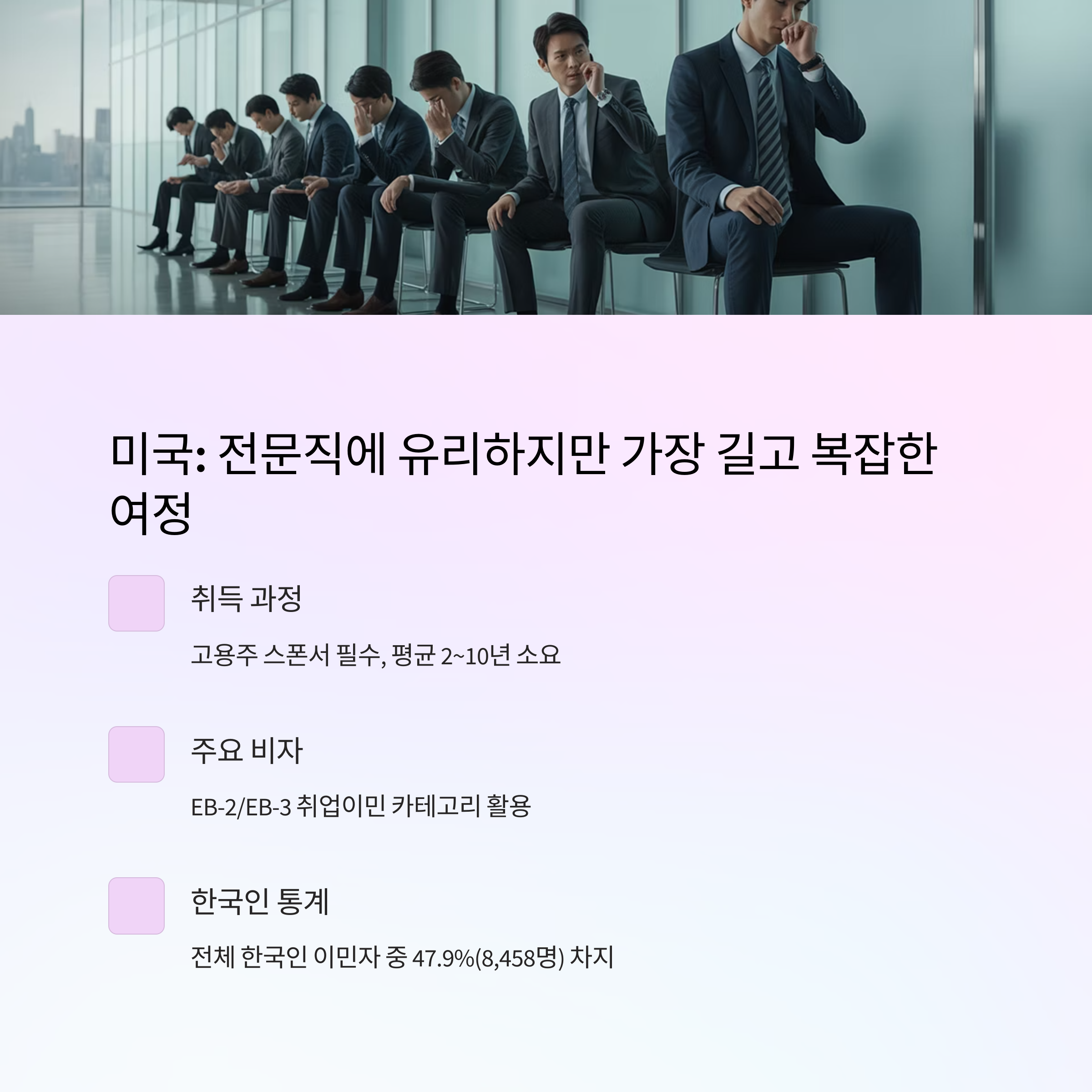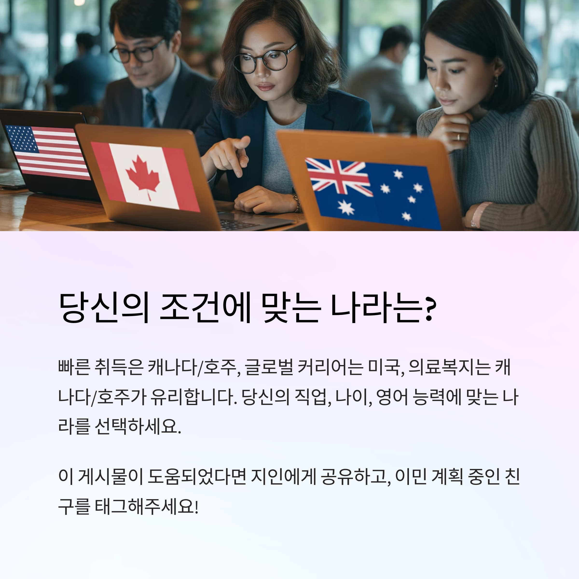 | 승인이 늦은 미국은 장기 전략 필요 | 호주는 영어 성적과 점수 산정 기준이 중요 | 영주권 우선순위에 맞는 직군 분석 필수 |