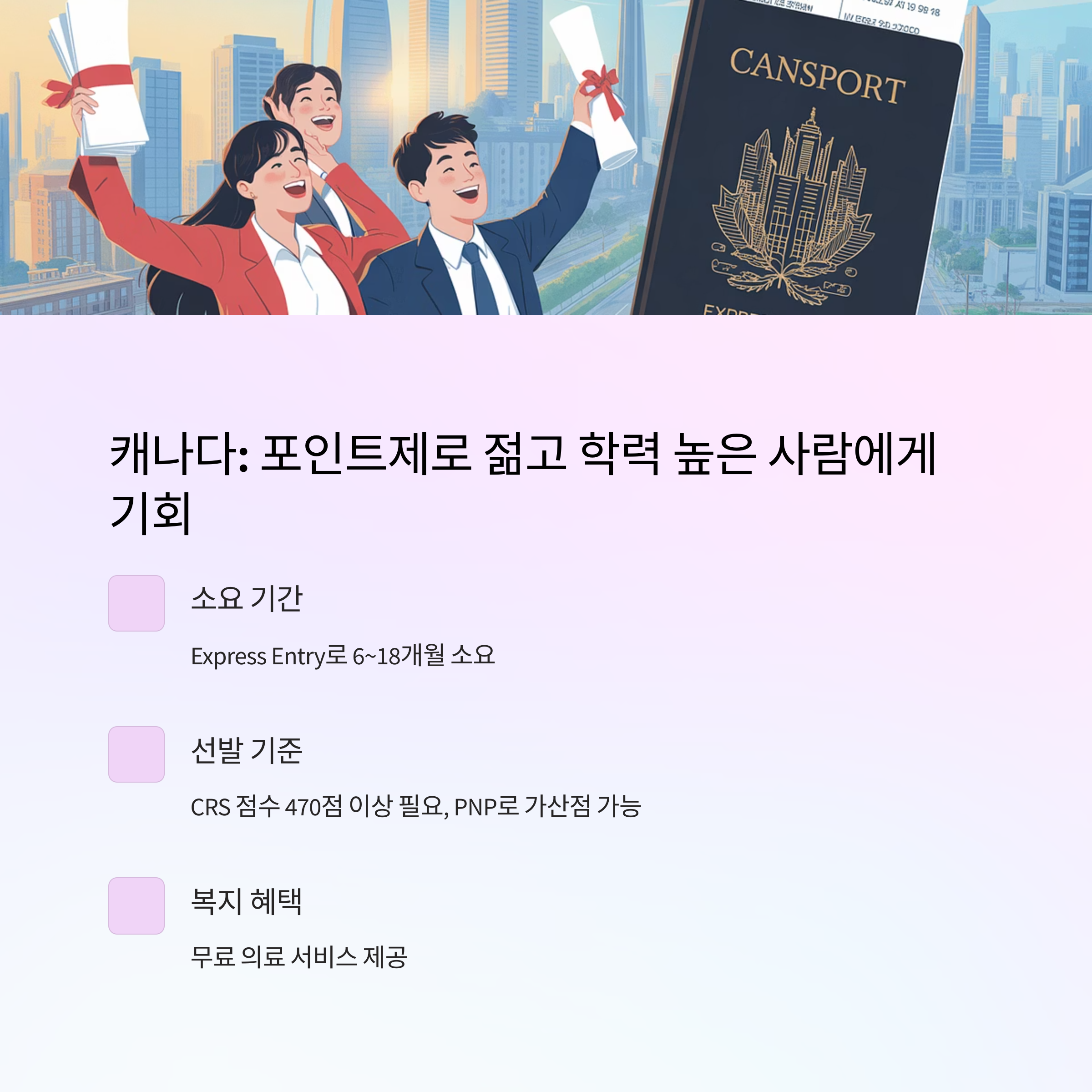 이민 전략의 핵심은 본인의 조건을 객관적으로 분석하고, 해당 조건에 최적화된 국가와 이민 유형을 찾는 것입니다. 학력, 영어 점수, 경력, 나이, 가족 유무 등 모든 요소가 점수에 반영되며, 준비 기간에 따라 결과는 크게 달라질 수 있습니다. 따라서 단순히 인기 국가만 보고 결정하기보다는 실제 승인률과 나의 경쟁력을 기준으로 전략을 세워야 성공 가능성이 높아집니다.