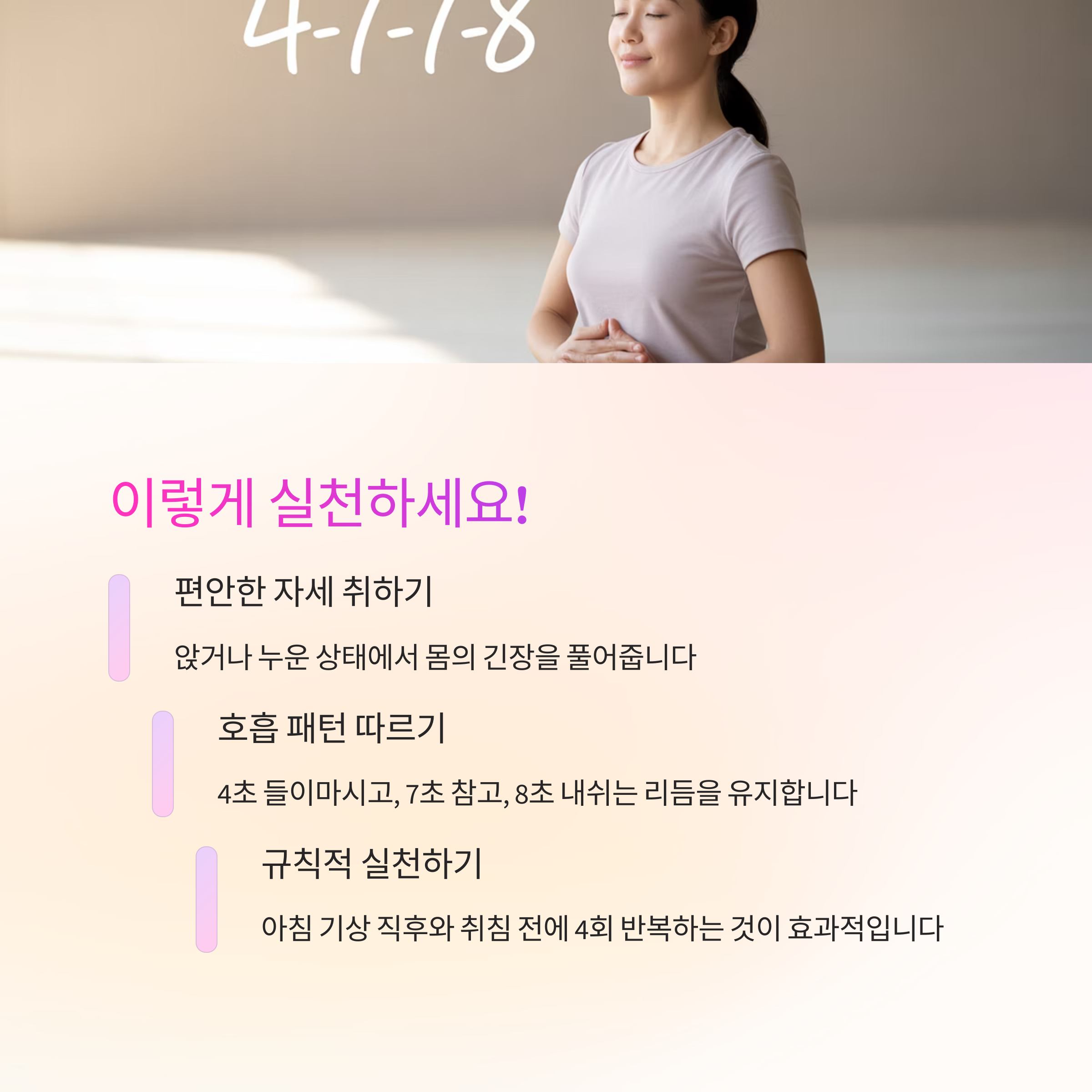 일정한 리듬은 긴장을 완화하고 집중력 향상 | 아침, 자기 전 3~5분 실천이 효과적 | 심신 안정 유도, 스트레스 호르몬 감소 유도 |