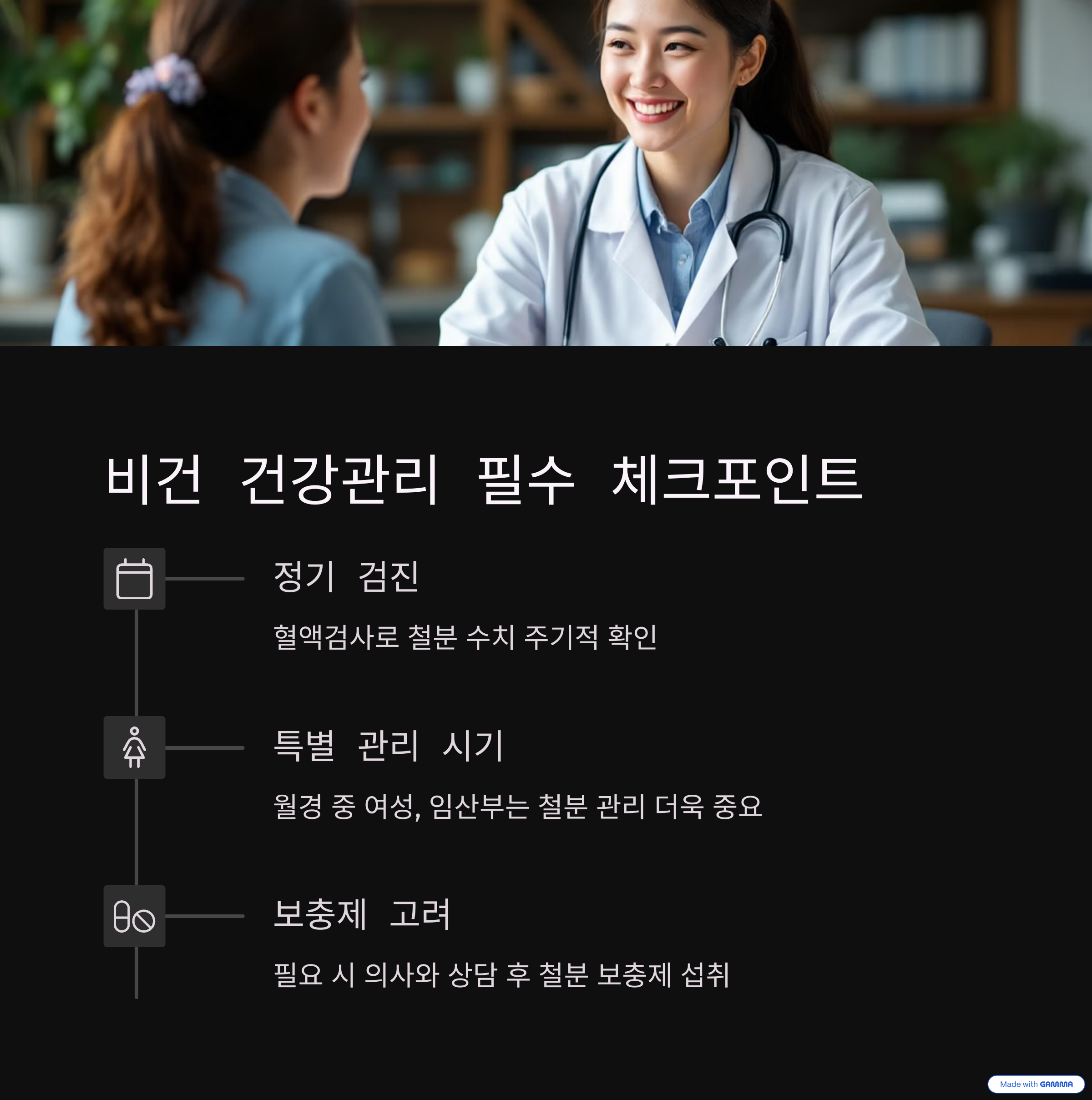 비건 식단을 실천하면서 철분 결핍을 예방하려면 식단에 대한 전략적인 접근이 필요합니다. 주기적인 건강검진을 통해 혈중 철분 수치를 체크하고, 필요 시 철분 보충제를 섭취하는 것도 고려해 볼 수 있습니다. 하지만 보충제 선택 시 철분 함량과 흡수율, 부작용 등을 꼼꼼히 확인해야 하며, 반드시 전문가의 상담을 통해 결정하는 것이 좋습니다. 장기적으로는 균형 잡힌 식단을 통해 부족한 영양소를 자연스럽게 보완하는 것이 가장 바람직한 방법입니다.