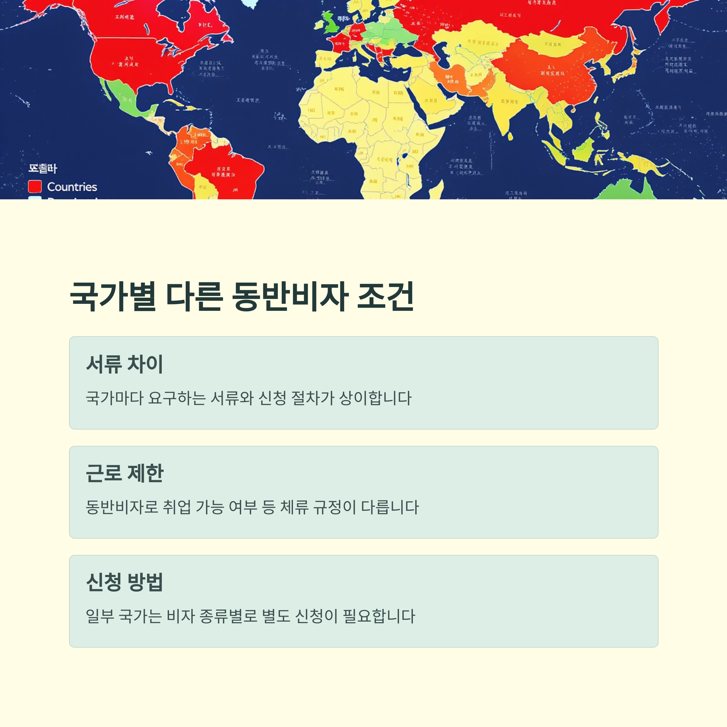 | 혼인증명서, 가족관계증명서는 공증 필수입니다. | 일부 국가는 배우자 근로가 제한됩니다. | 공인된 번역사 또는 전문 번역업체 이용 권장 |