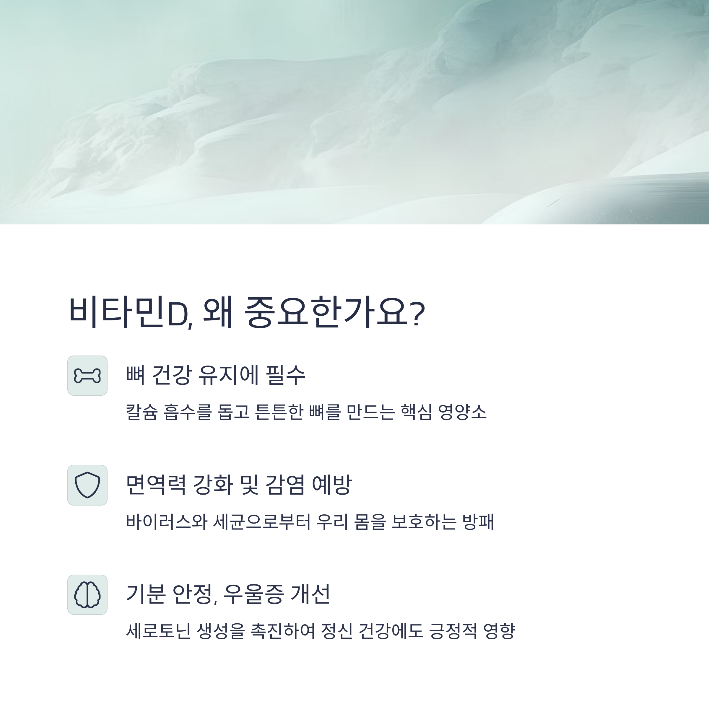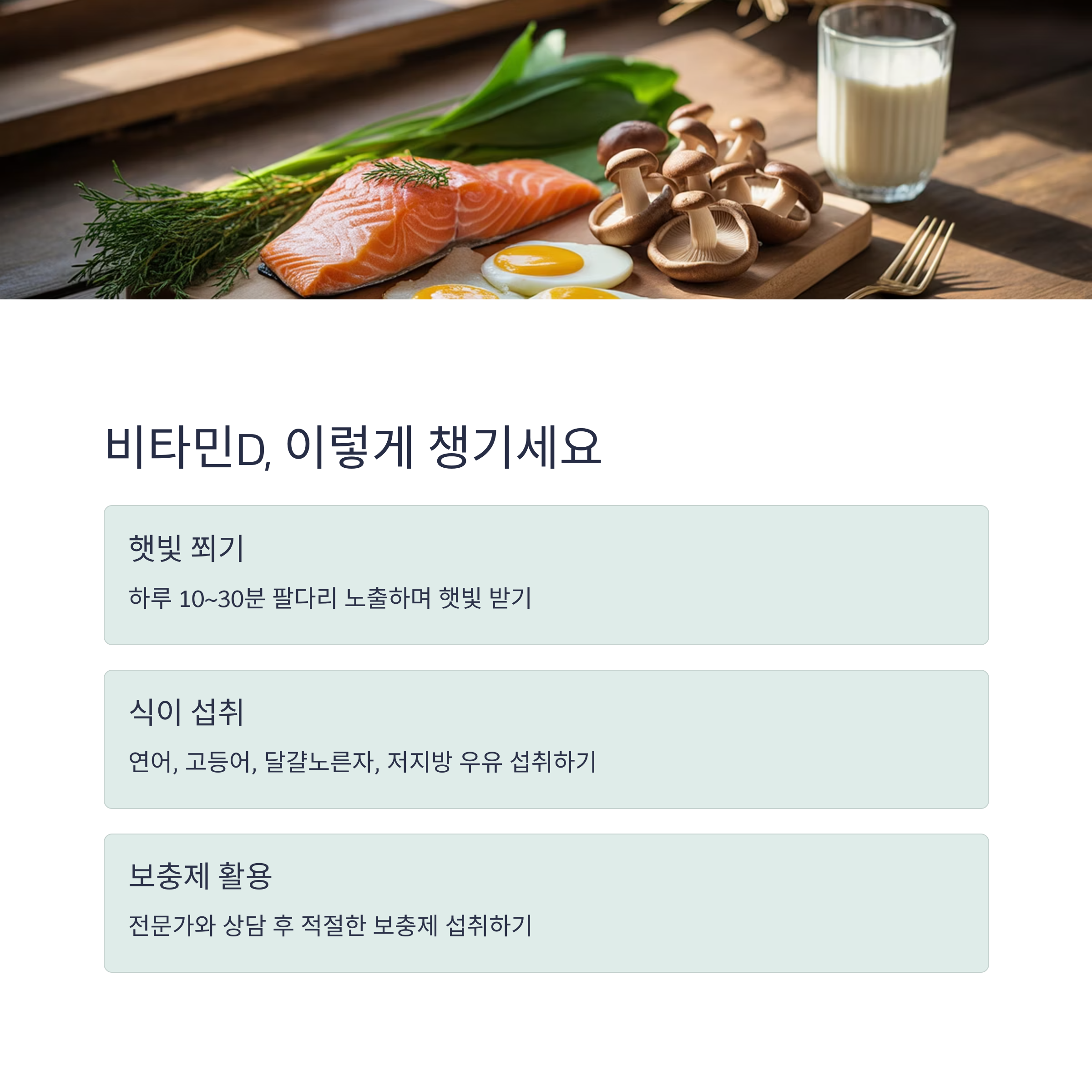 | 면역력 강화, 뼈 건강 유지, 기분 안정에 도움 | 피로감, 근육 약화, 골절 위험 증가 등 | 햇볕, 음식(연어, 달걀), 영양제 활용 |