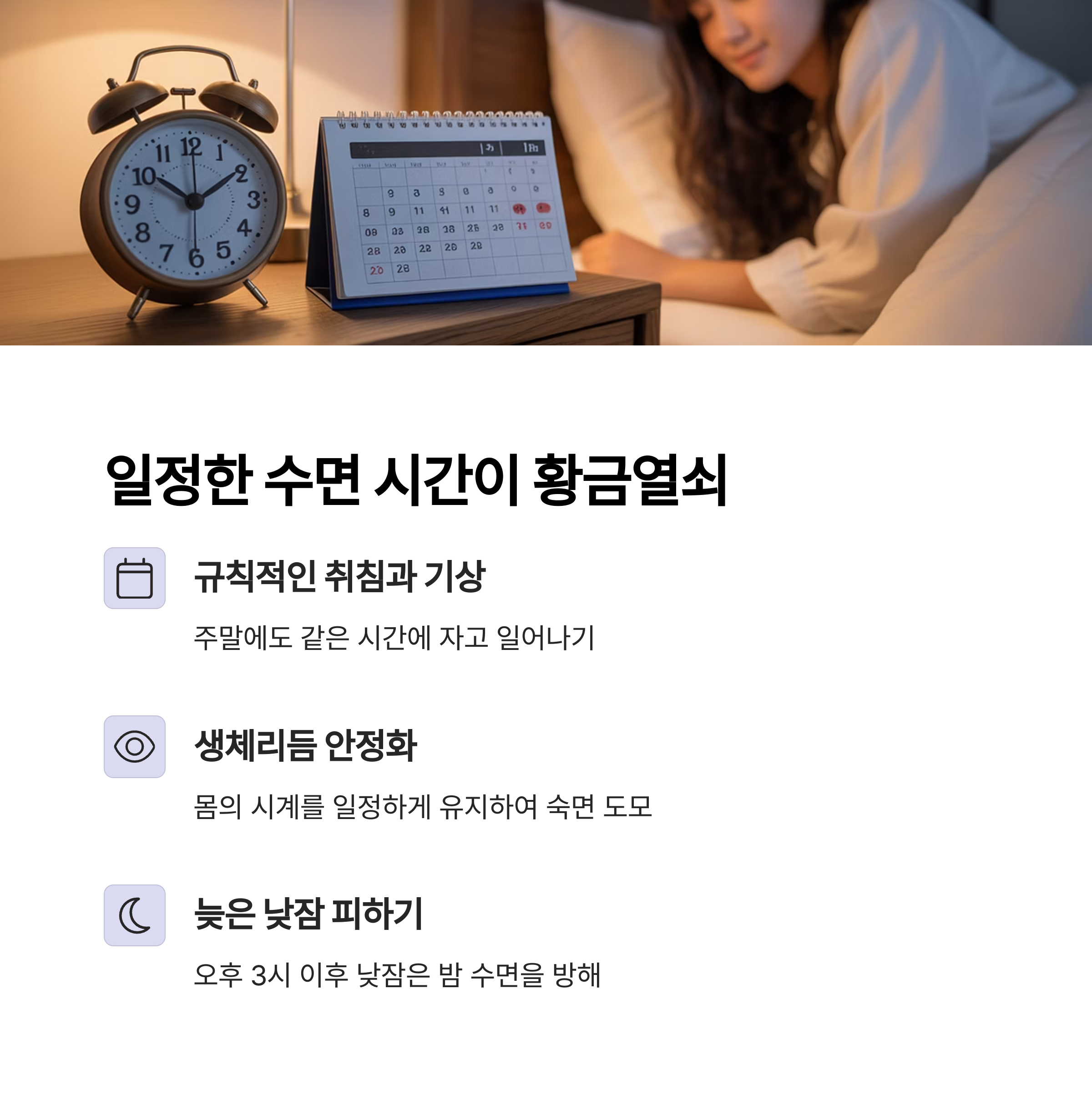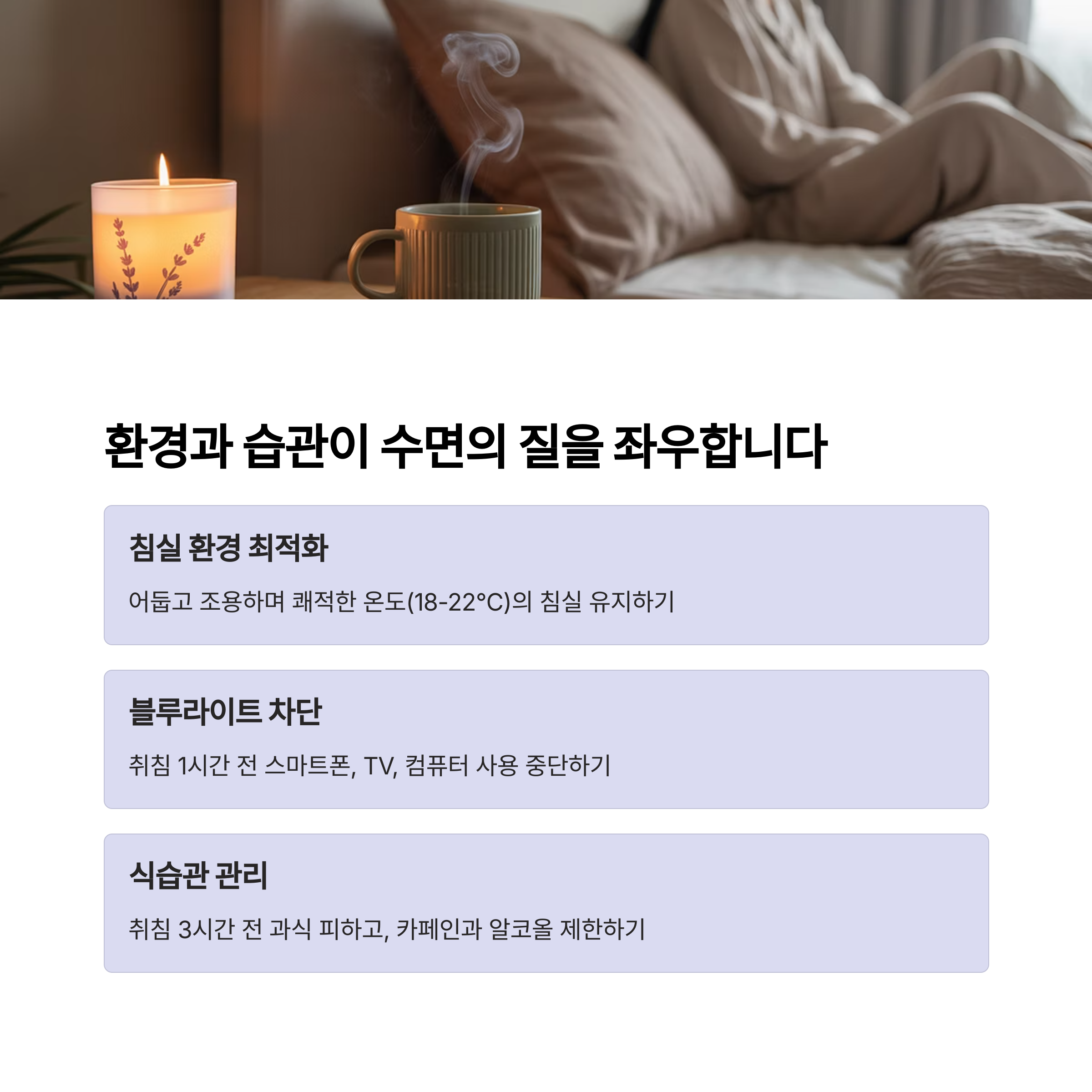 숙면 방법 실천 가능한 생활 습관으로 숙면을 유도합니다.