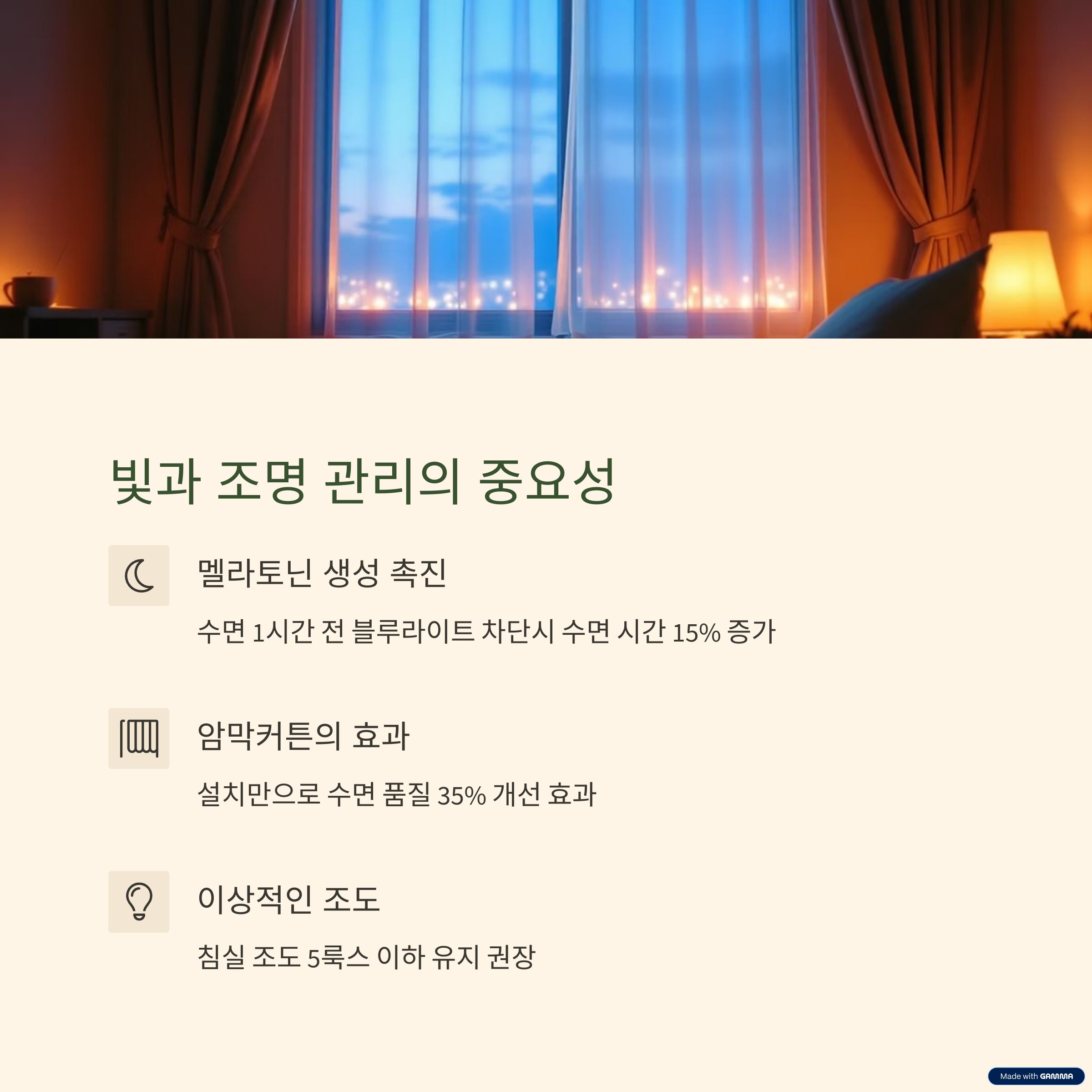 | 계절에 따라 온도를 조절하세요. | 스마트 조명으로 자동화하는 것도 좋아요. | 베개와 이불도 중요한 요소입니다. |