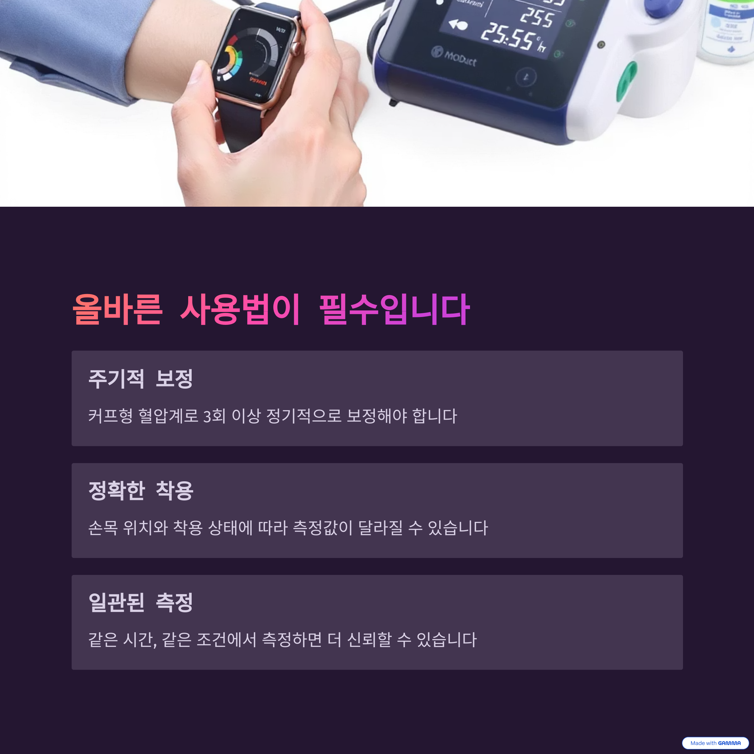 | 정확도는 기기마다 다르며 일정한 보정이 필요 | 손목 위치, 움직임, 센서 오류 등 다양한 변수 | 심장 높이에 맞춰 착용, 일정한 시간 측정 권장 |