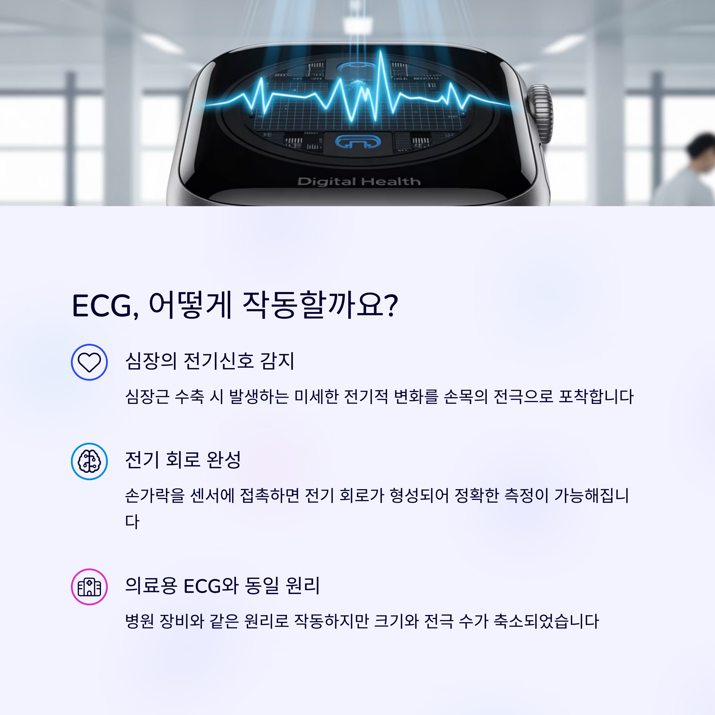 심장의 전기 신호를 측정하는 기능입니다. | 불규칙한 심장 박동을 의미하는 질환입니다. | 심박수, 산소포화도, 수면 등 다양하게 지원합니다. |