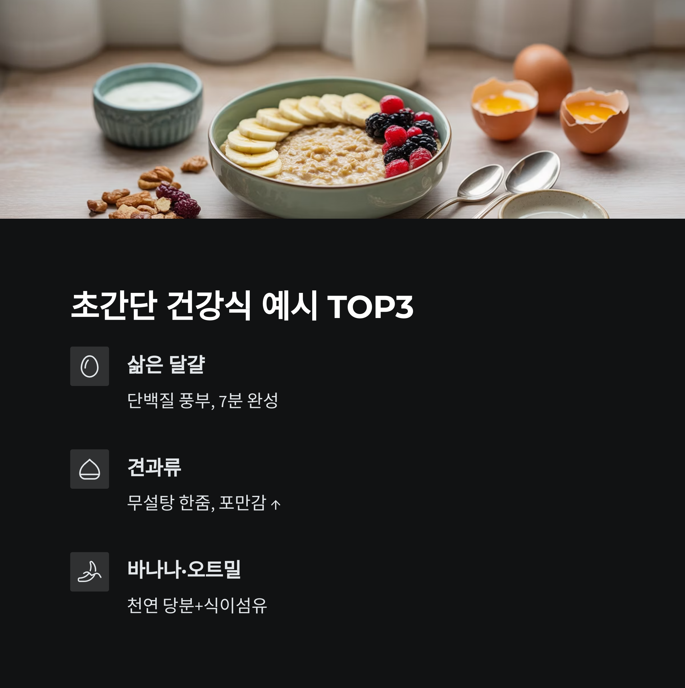 식단만 잘 구성한다면 충분합니다. 삶은 달걀, 통곡물 시리얼, 과일, 견과류 등을 조합하면 단백질과 비타민, 섬유질까지 모두 챙길 수 있습니다.