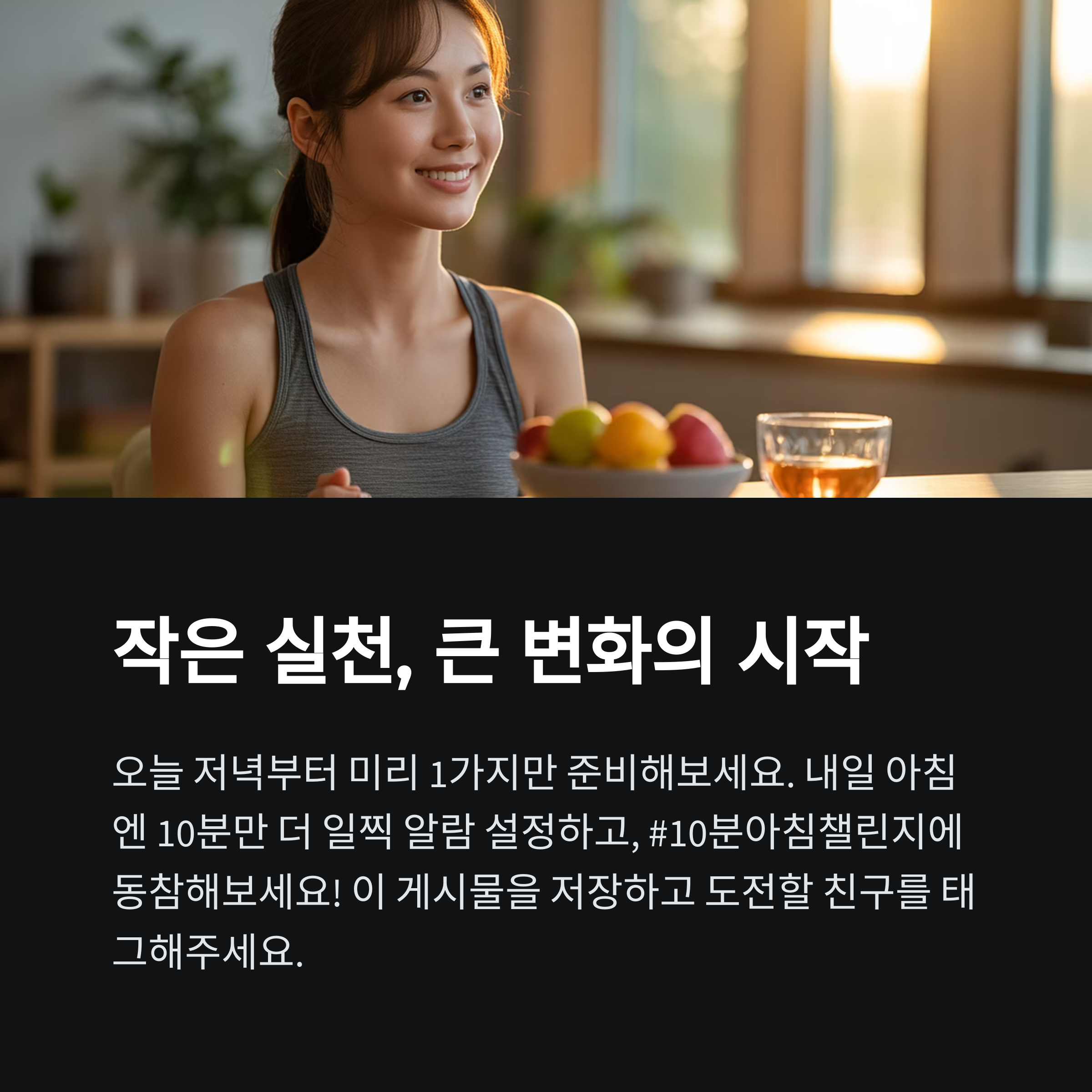 아침을 준비하는 시간은 생각보다 우리 삶에 큰 영향을 미칩니다. 단 10분이면 하루의 활력과 건강을 챙길 수 있는 기회를 만들 수 있습니다. 처음에는 익숙하지 않을 수 있지만, 매일 같은 시간에 간단한 식사를 준비하는 습관을 들이면 몸은 곧 변화에 반응하기 시작합니다. 작은 실천이 큰 건강으로 이어지는 것, 지금 시작해 보세요.