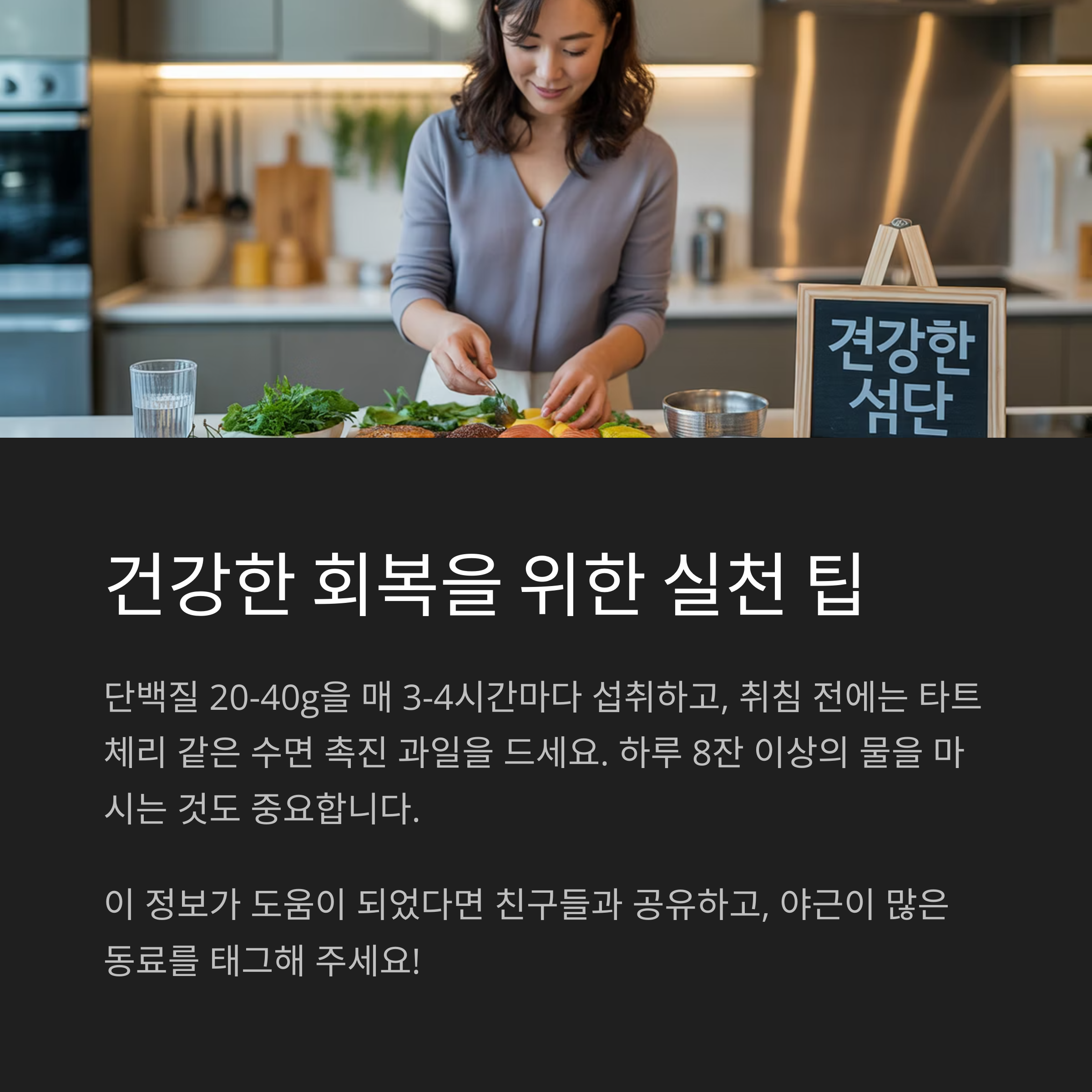 회복 음식으로는 미역국, 달걀찜, 귀리죽 같은 소화가 잘 되는 고단백 저지방 식품이 좋습니다. 또한 비타민C가 풍부한 키위, 블루베리, 파프리카 등을 더하면 피로 회복과 면역력 향상에 큰 도움을 줍니다. 이러한 식단은 야식으로도 부담이 적고, 위에 부담을 주지 않아 숙면에도 도움이 됩니다.