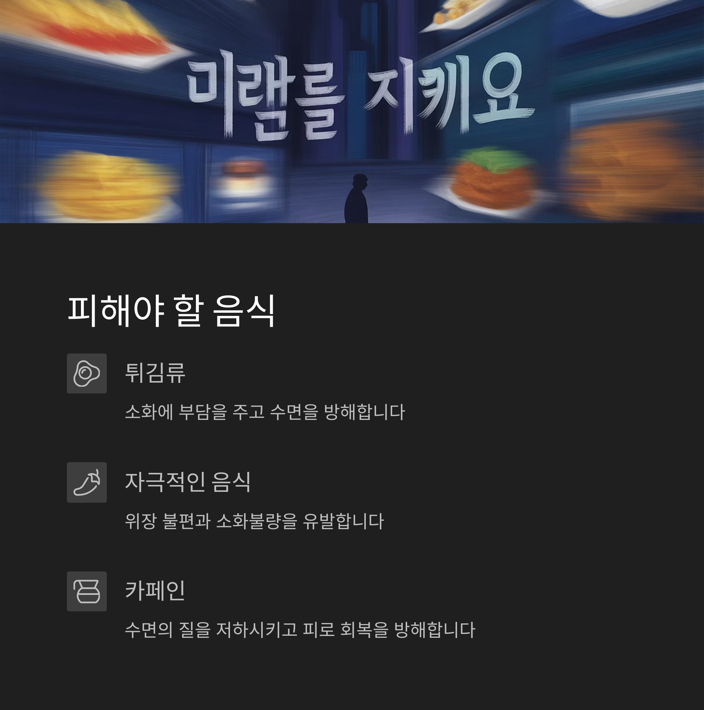 미역국, 달걀찜, 닭가슴살 등 소화 잘되는 음식 | 비타민, 미네랄 풍부한 과일과 채소 중심 식단 | 야식으로 부담 없고 든든한 저칼로리 식품 |