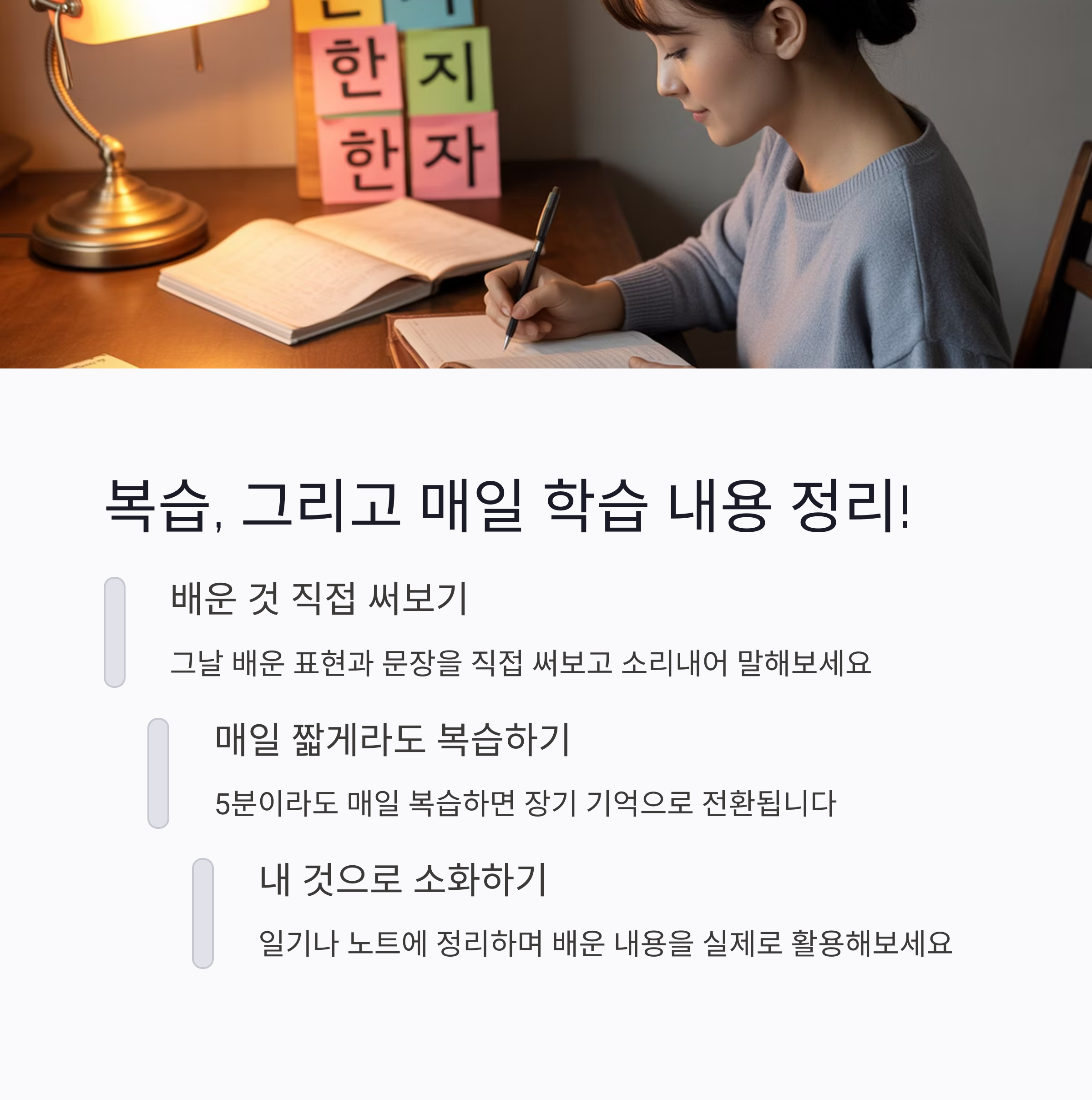 | 친구들과 대화하면서 자연스럽게 익힐 수 있습니다. | 언어교환, 자원봉사 등도 좋은 방법입니다. | 노트 정리나 음성 녹음 복습도 효과적입니다. |