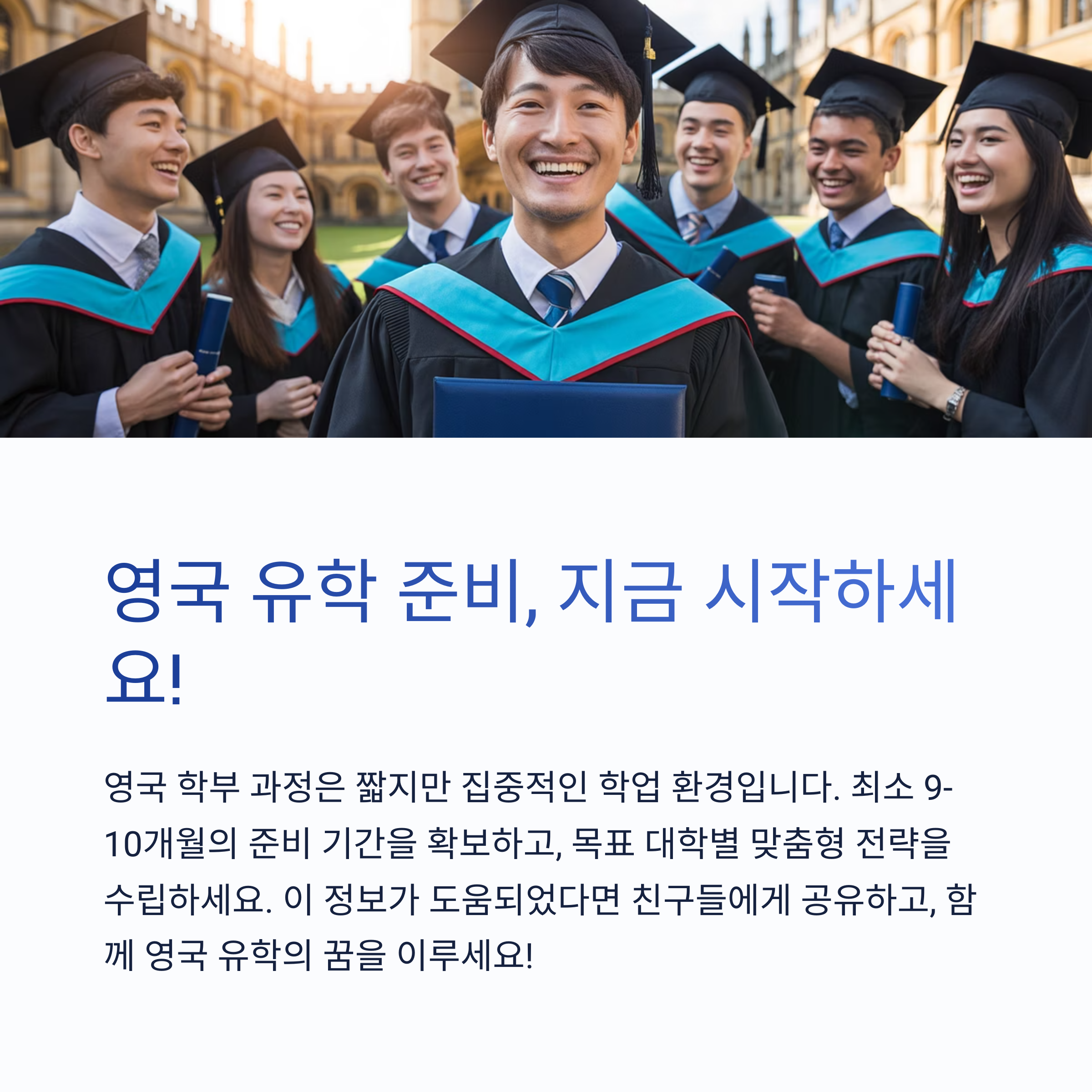영국 대학 입학은 분명한 계획과 철저한 준비가 필요합니다. UCAS 시스템 이해부터 공인 영어 성적 준비, 자기소개서 작성, 추천서 확보까지 모든 과정은 하나의 큰 그림 안에서 유기적으로 작동해야 합니다. 이 글을 통해 유학 준비의 막막함이 조금이나마 해소되셨길 바라며, 지금 시작하면 충분히 성공적인 결과를 얻을 수 있습니다. 여러분의 꿈을 향한 여정, 지금 바로 그 첫걸음을 내디뎌보세요!