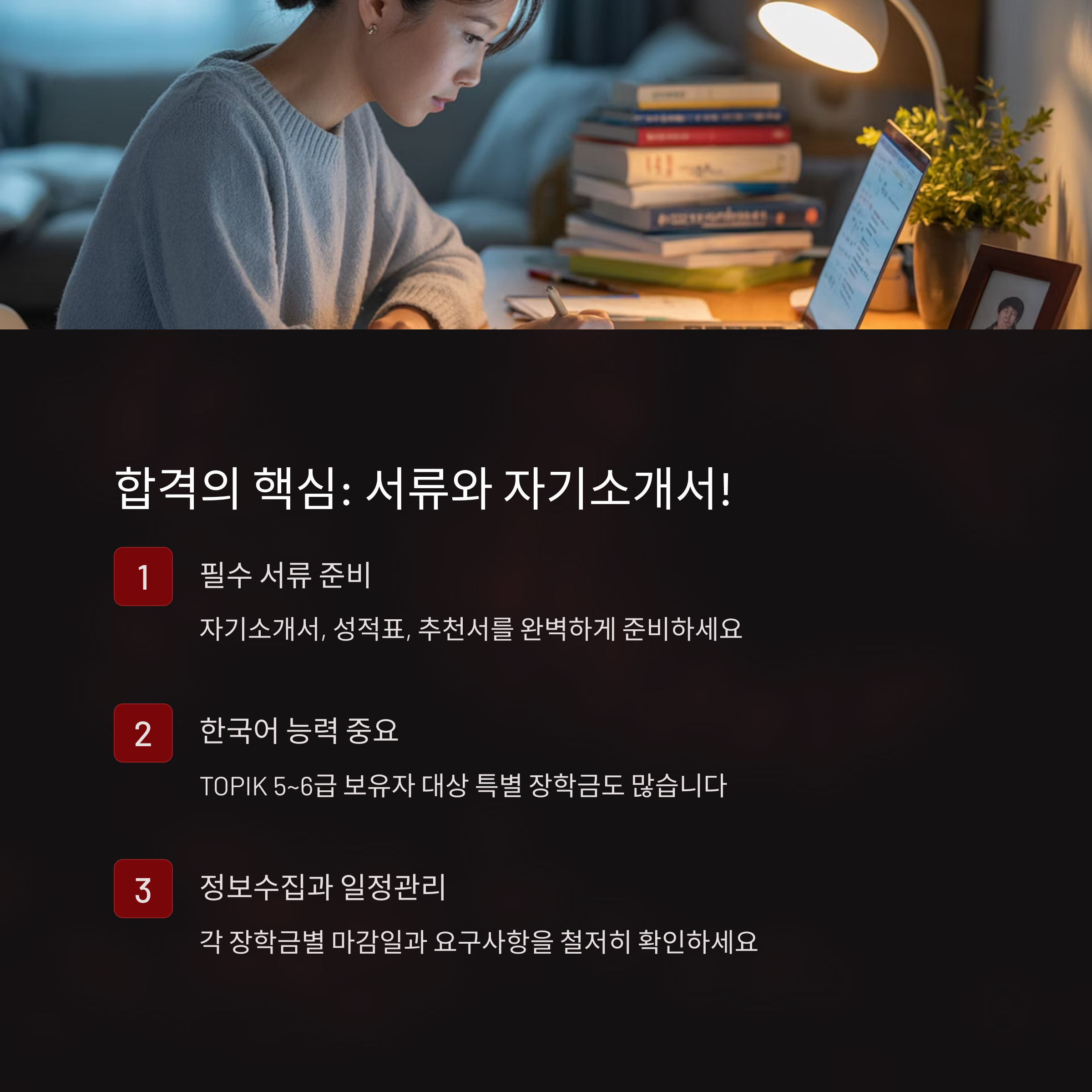 장학금 정보를 최대한 많이 수집하고 다양한 출처를 통해 신청할 수 있는 채널을 확보하는 것이 중요합니다. 대학 내 포스터, 이메일 뉴스레터, 외국인 유학생 커뮤니티, 유튜브 및 블로그 등을 통해 꾸준히 정보를 얻고, 신청 시에는 자기소개서, 성적 증명서, 추천서 등을 철저하게 준비해 두는 것이 좋습니다. 또한, 여러 장학금을 동시에 신청할 수 있으므로 중복 지원도 적극 활용해보세요.