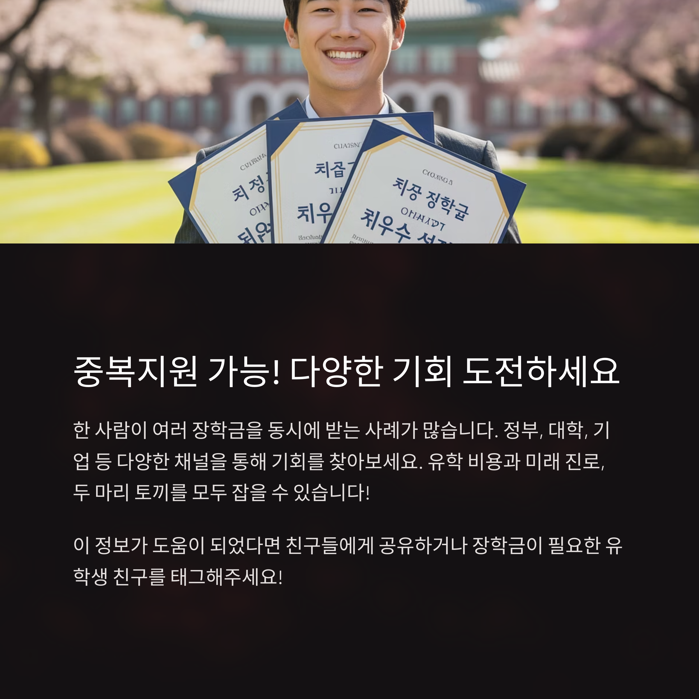 이번 포스팅을 통해 본인의 조건에 맞는 장학금이 있는지 체크하고, 꼭 도전해 보시길 바랍니다!