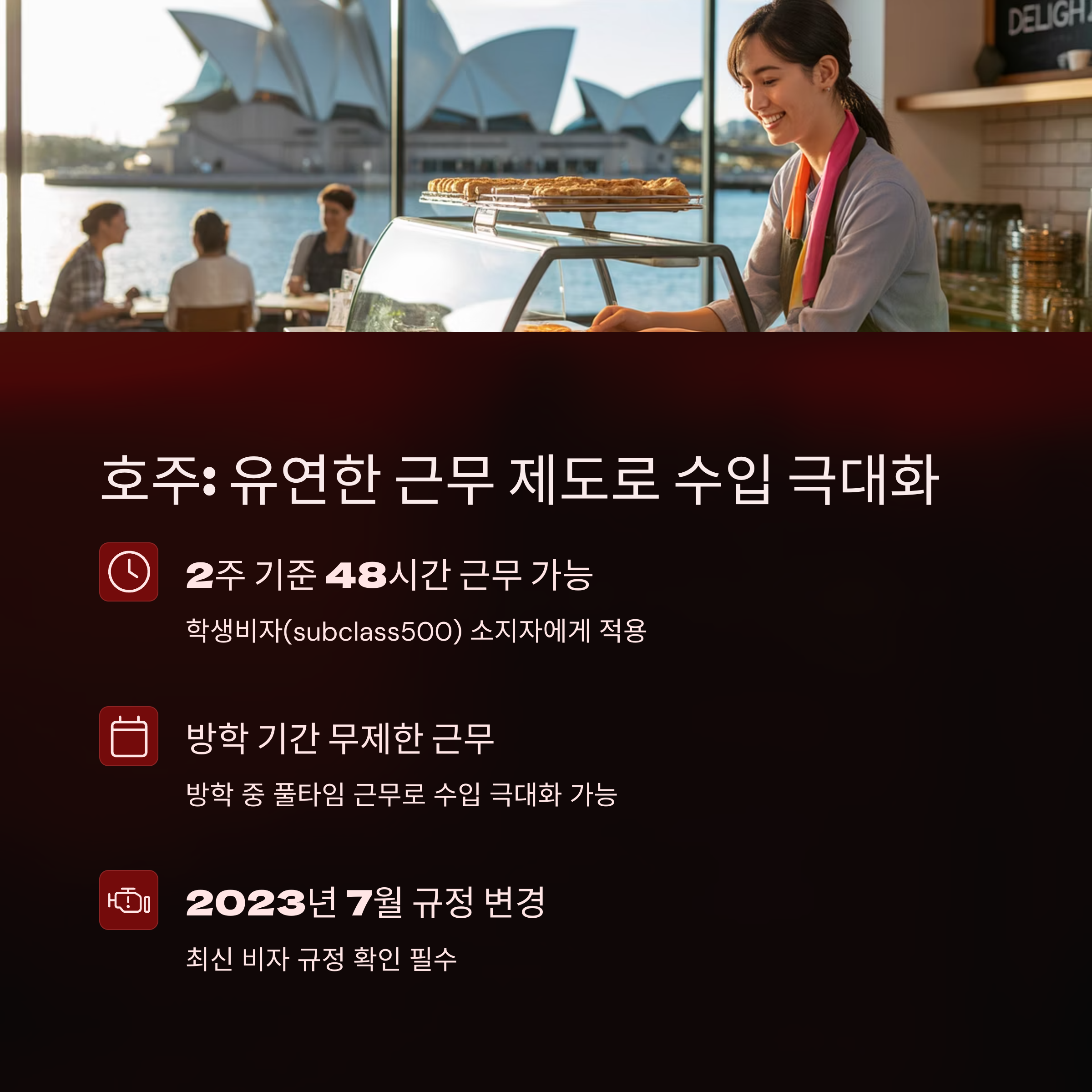 | 학기 중 주 20시간, 방학 중 풀타임 가능 | 세후 수입 기준, 호주·뉴질랜드 인기 | 언어 능력 향상, 실무경험 축적, 인맥 형성 |