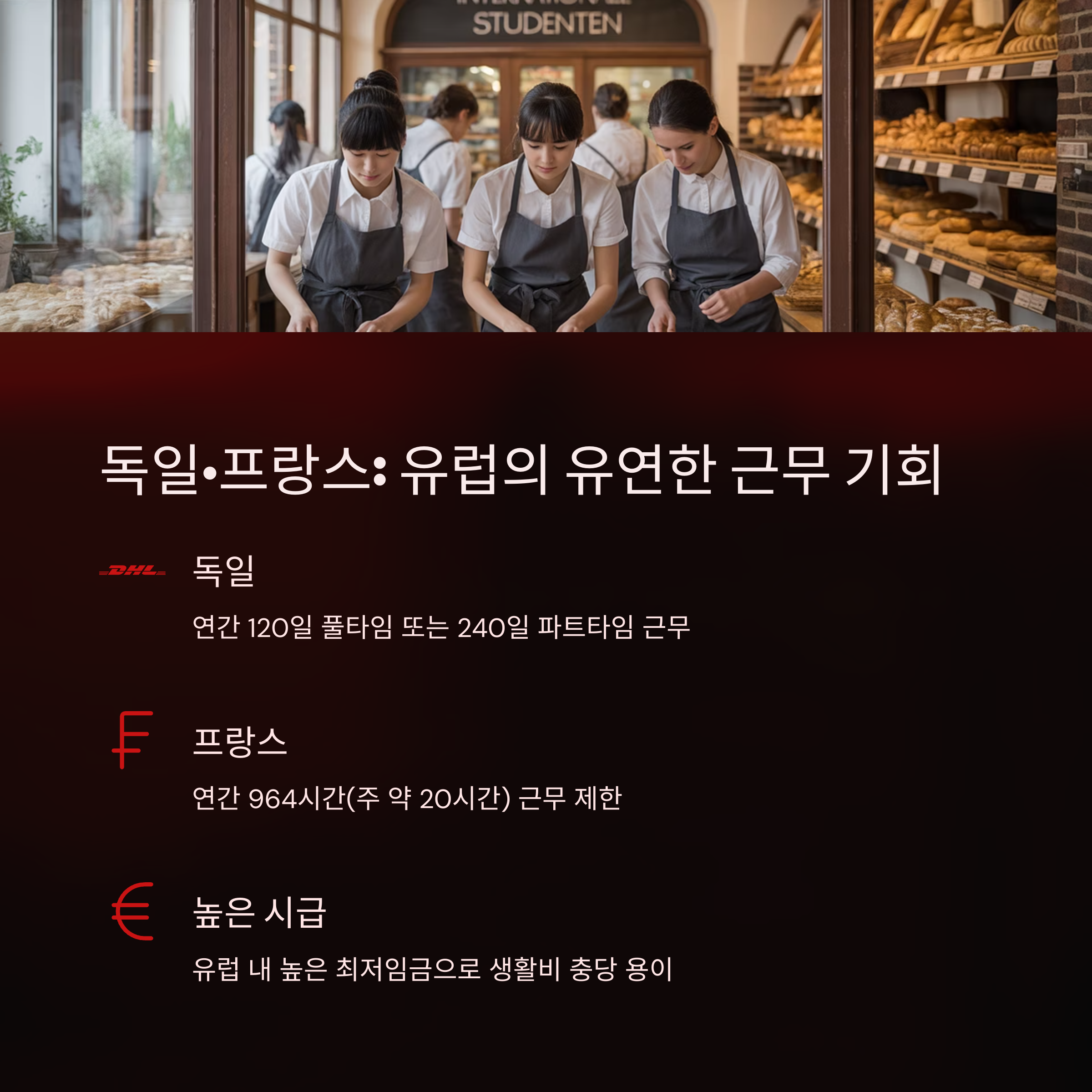 | 호주, 뉴질랜드, 독일, 캐나다, 프랑스 등 | 시급 10~25달러, 나라마다 상이함 | 생계 유지를 위한 수입 + 현지 적응력 향상 |