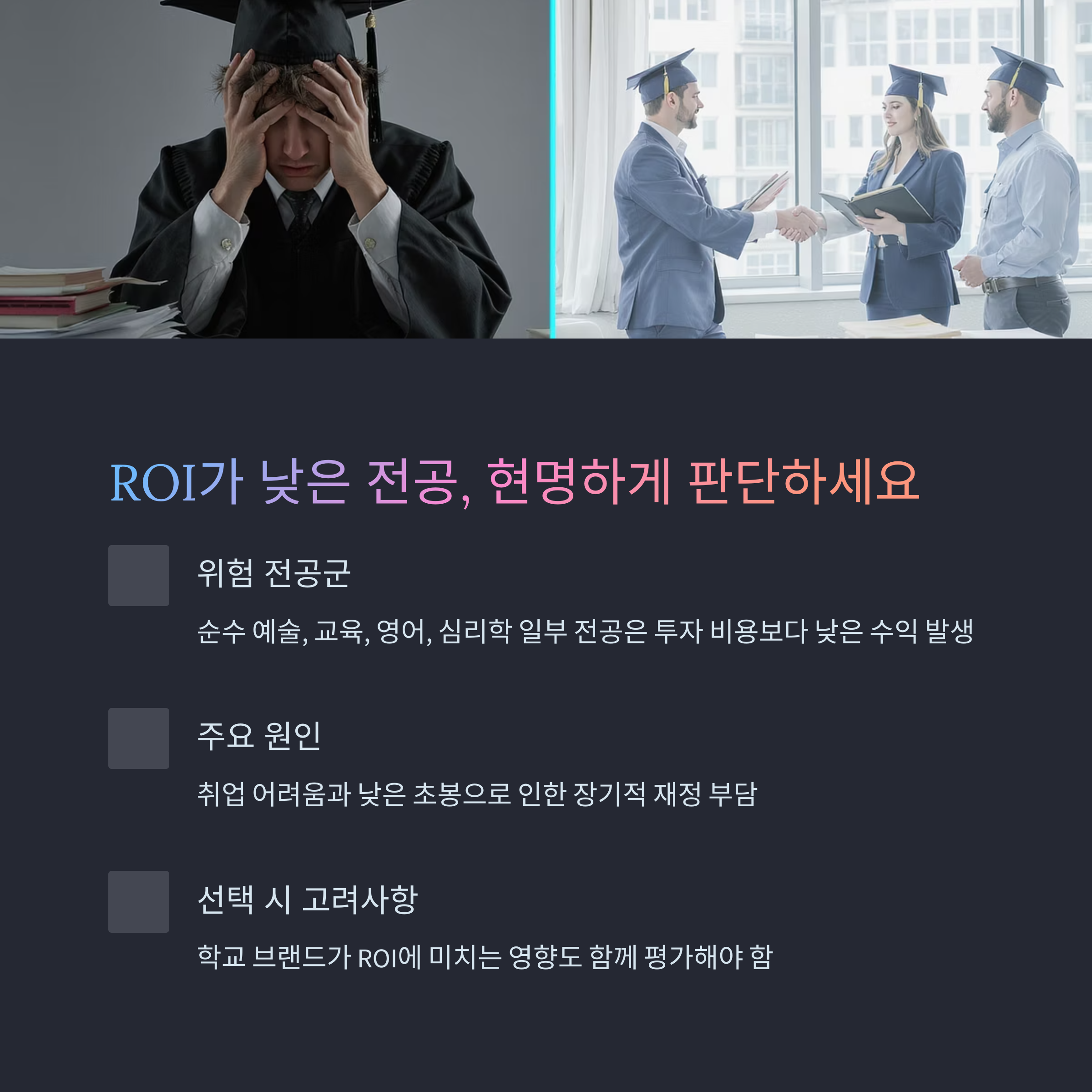 | ROI 높은 전공 | 졸업 후 연봉과 취업률이 높은 학과 |