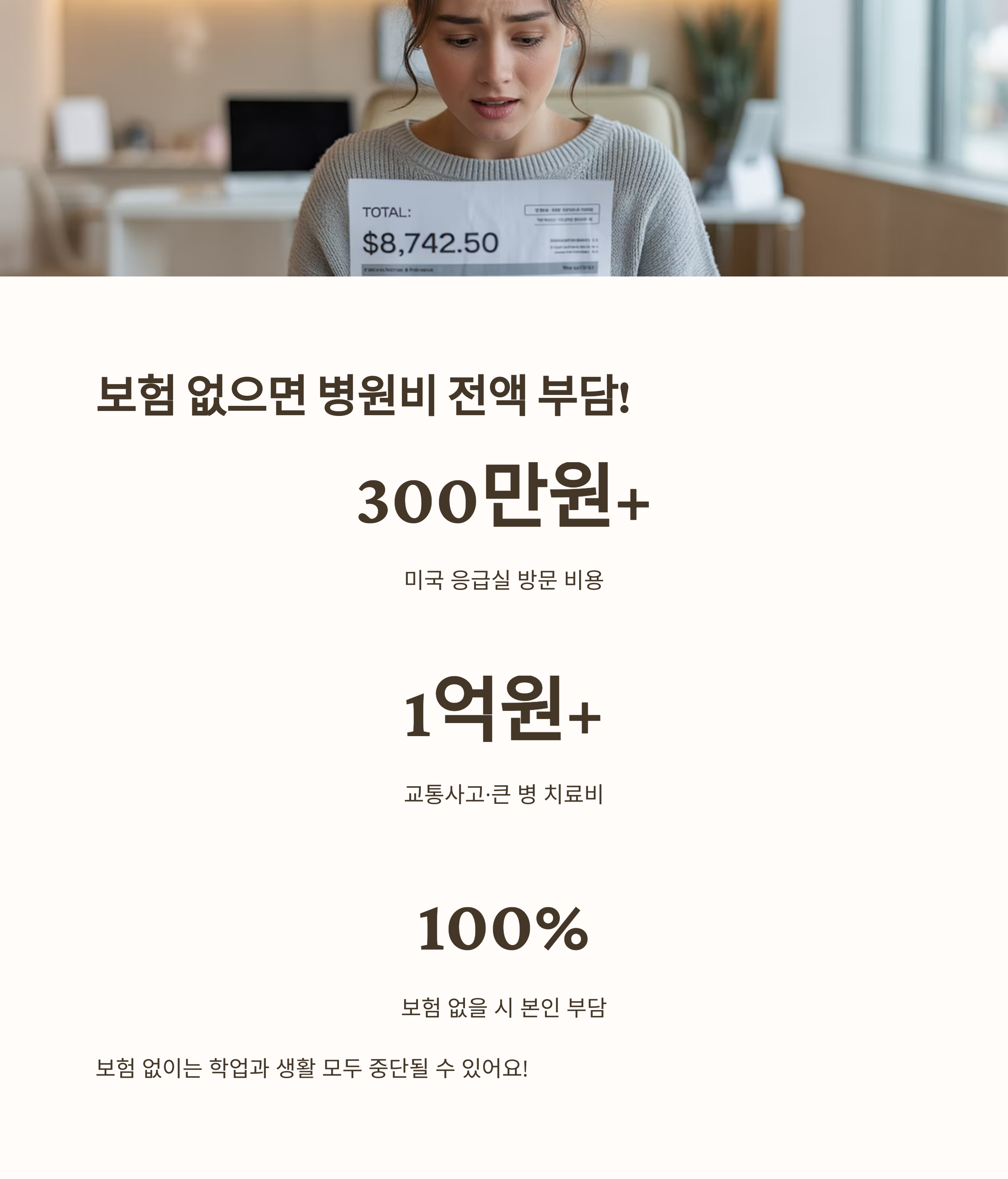 유학생 보험은 단순한 선택이 아닌 필수입니다. 낯선 타지에서 아플 경우 현지 병원비는 국내보다 훨씬 높은 경우가 많고, 상황에 따라 진료 한 번에 수십만 원이 청구되기도 합니다. 실제로 한 유학생은 단순한 맹장 수술에도 수백만 원의 비용을 지불해야 했고, 보험 없이 이를 감당하느라 학업에 큰 어려움을 겪었습니다. 보험은 이러한 돌발 상황에서도 금전적 부담을 덜어주며 안정적인 유학생활을 가능하게 합니다.