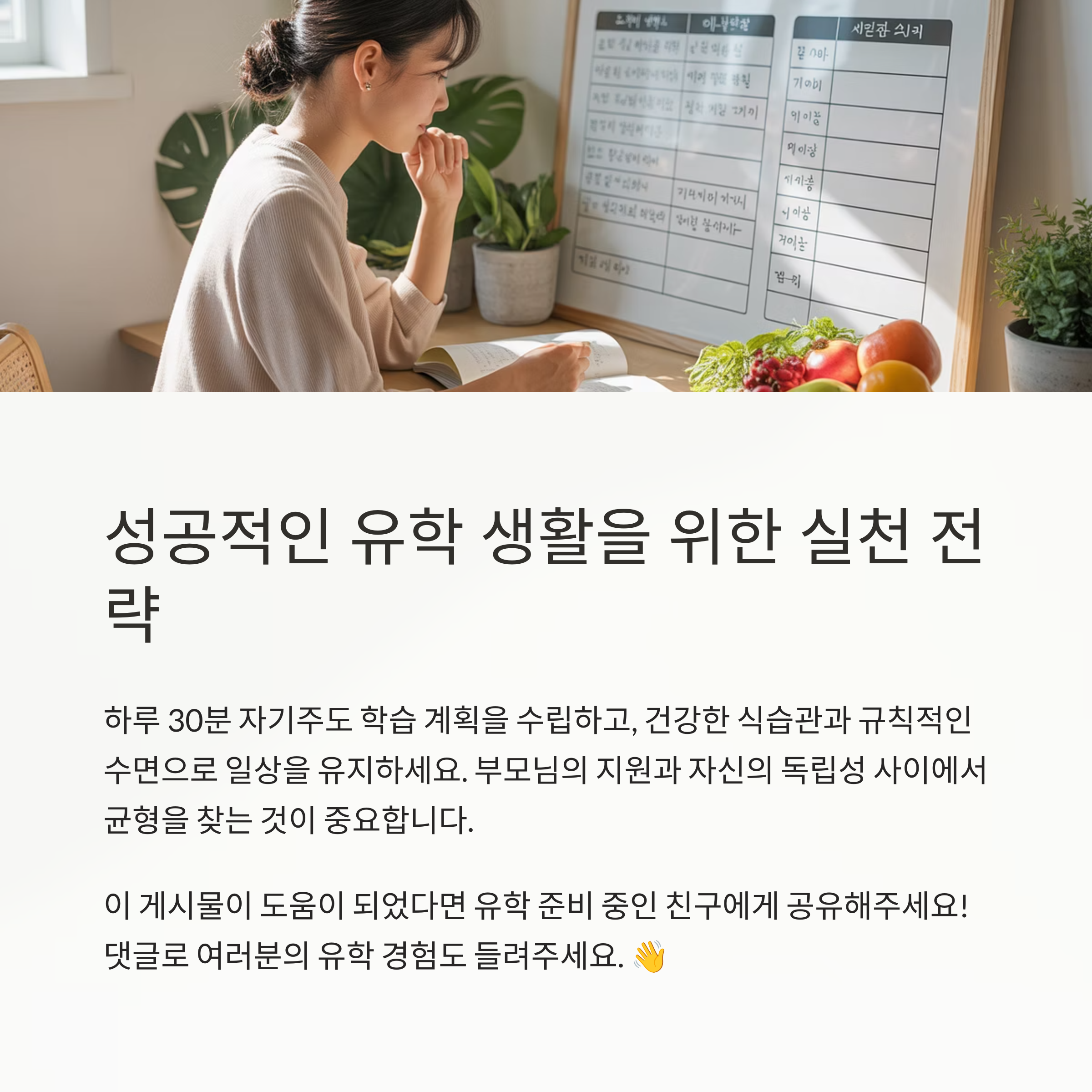 본문을 읽고 느낀 점, 혹은 본인의 유학 경험이 있다면 댓글로 공유해 주세요. 여러분의 이야기가 또 다른 누군가에게 큰 도움이 됩니다. 작은 습관 하나가 큰 변화를 만듭니다.