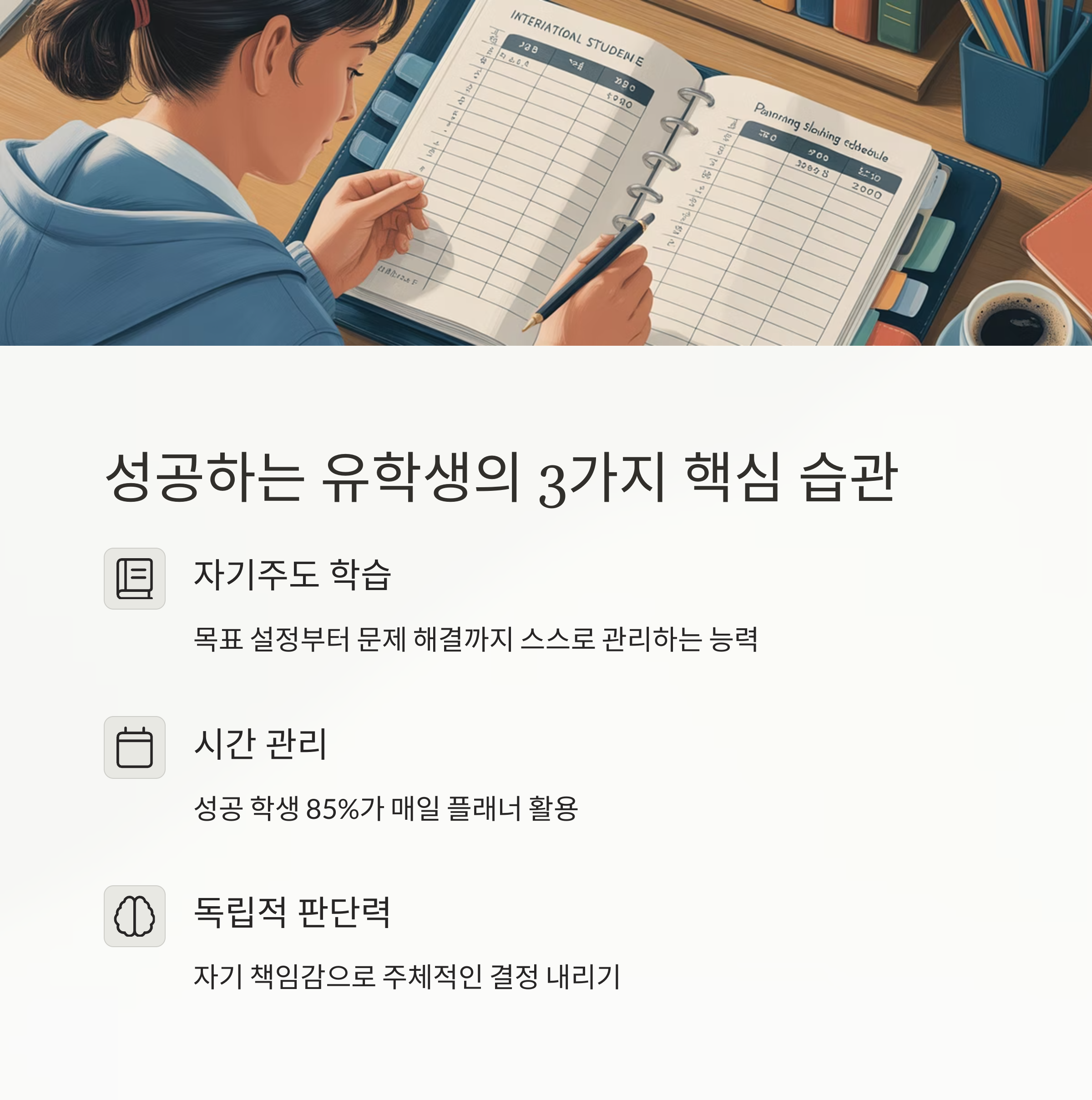유학 성공 습관 | 자기주도 학습, 현지 커뮤니티 참여, 루틴 생활 |