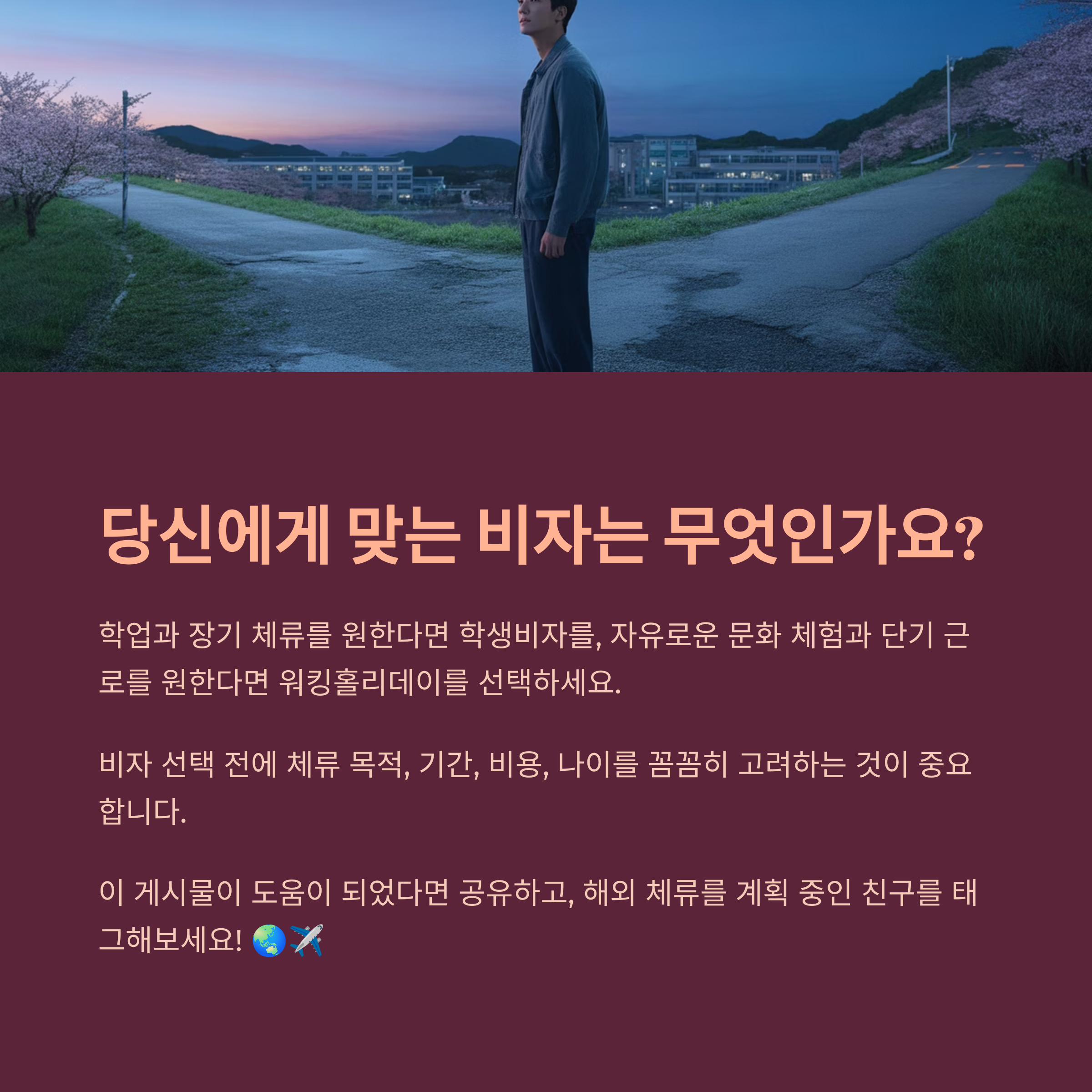 해외 체류의 방법은 다양하지만 자신에게 맞는 길을 찾는 것이 가장 중요합니다. 단순히 비자 제도의 장점만을 보고 선택하기보다는 본인의 장기적 목표, 현재 여건, 재정 상황 등을 종합적으로 고려해야 후회 없는 선택이 될 수 있습니다. 학생비자와 워킹홀리데이는 서로 다른 방향을 지닌 길이지만, 결국 모두가 더 나은 미래를 향한 발걸음이라는 점에서 그 의미는 결코 가볍지 않습니다. 이 글이 여러분의 선택에 작은 이정표가 되기를 바랍니다.