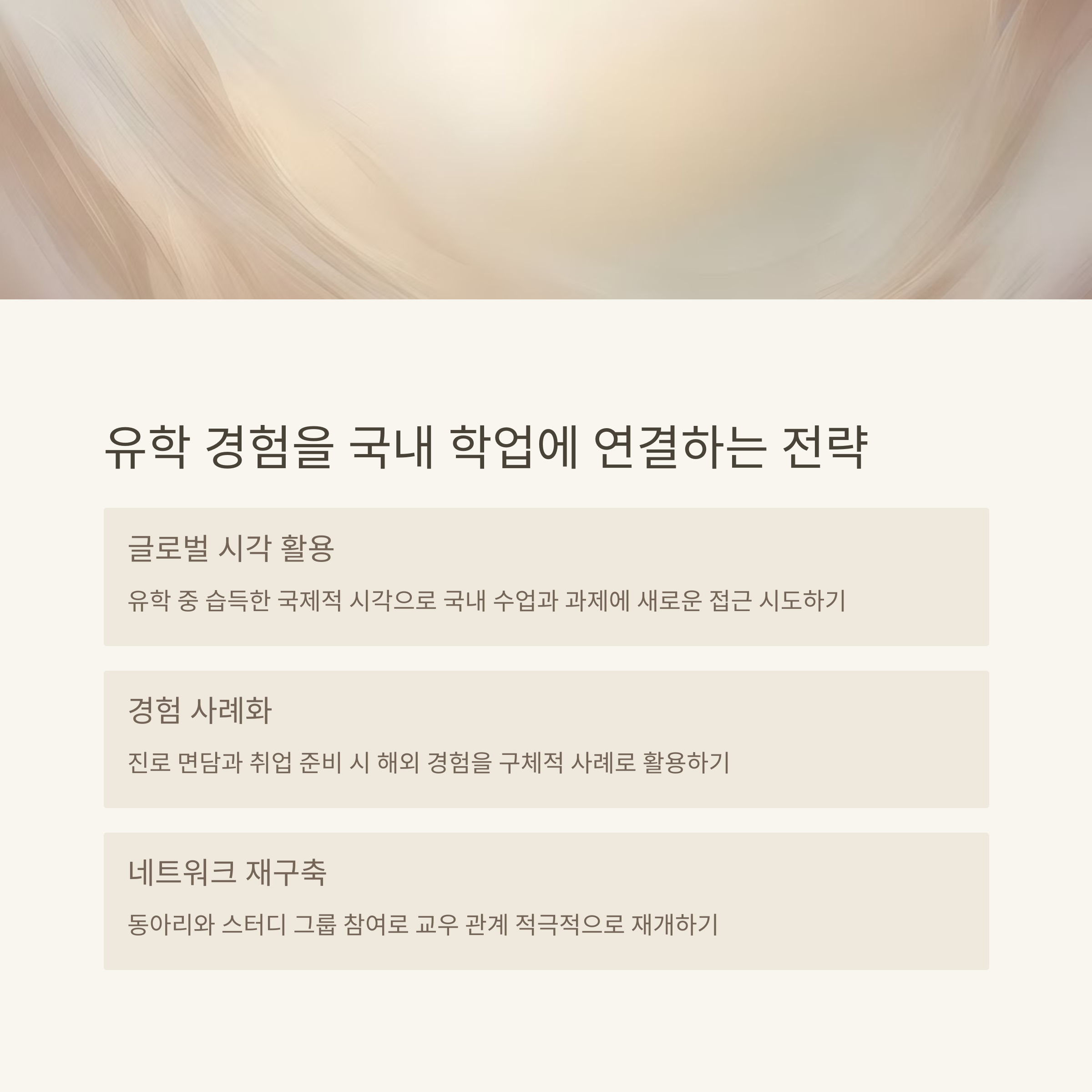 결국 복학 성공의 핵심은 유학 경험을 국내 학업과 자연스럽게 연결하는 데 있습니다. 이를 위해 '교양 학점'을 전략적으로 선택하거나, 학과 내에서의 팀 프로젝트를 통해 빠르게 소통 기반을 회복하는 것이 유리합니다. 더불어, 멘탈 관리와 루틴 복귀 훈련 또한 중요합니다. 복학 전 일정 기간을 두고 국내 생활 리듬에 익숙해지는 연습이 필요하며, 전문가의 상담을 받는 것도 효과적인 방법입니다.