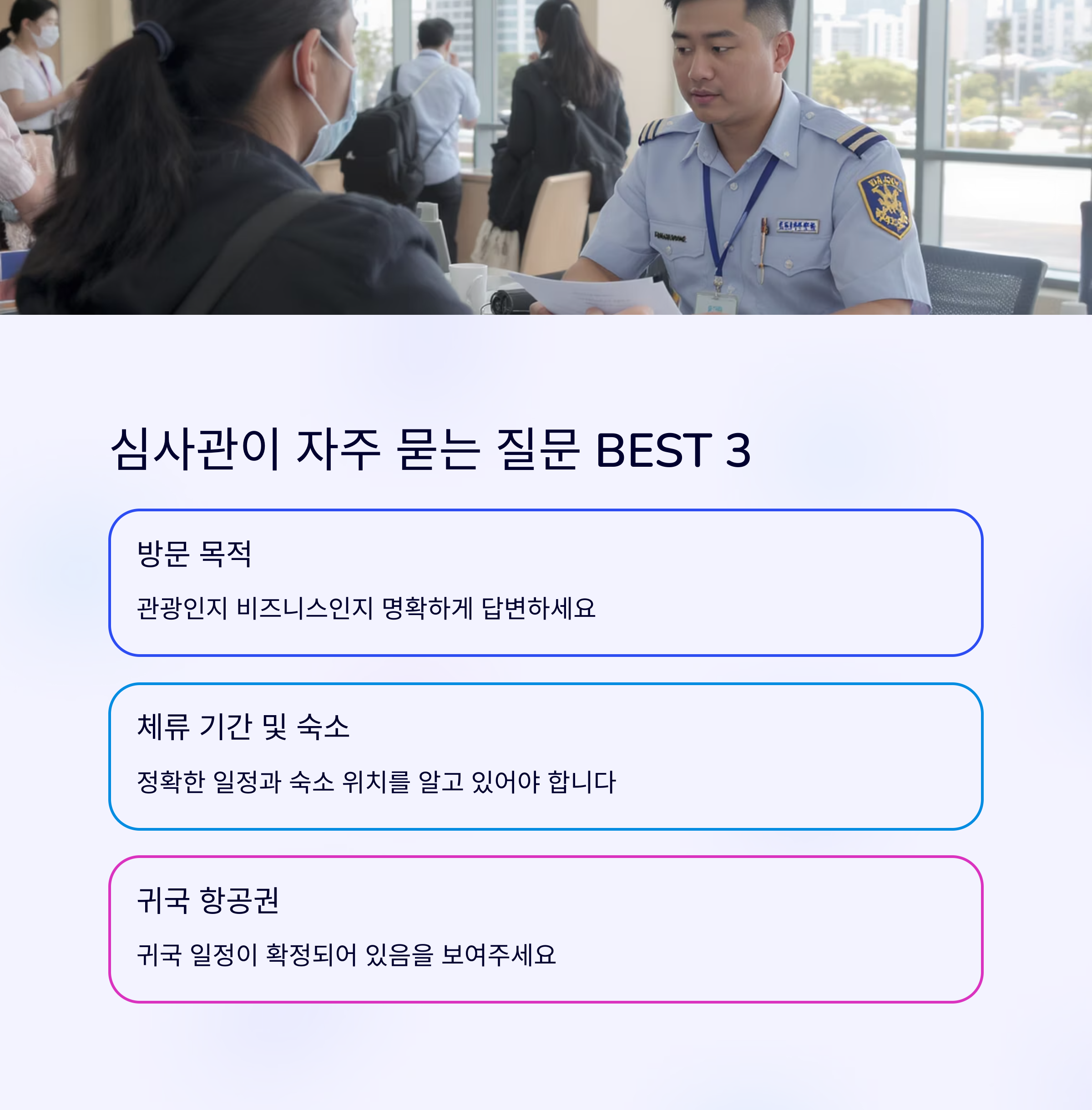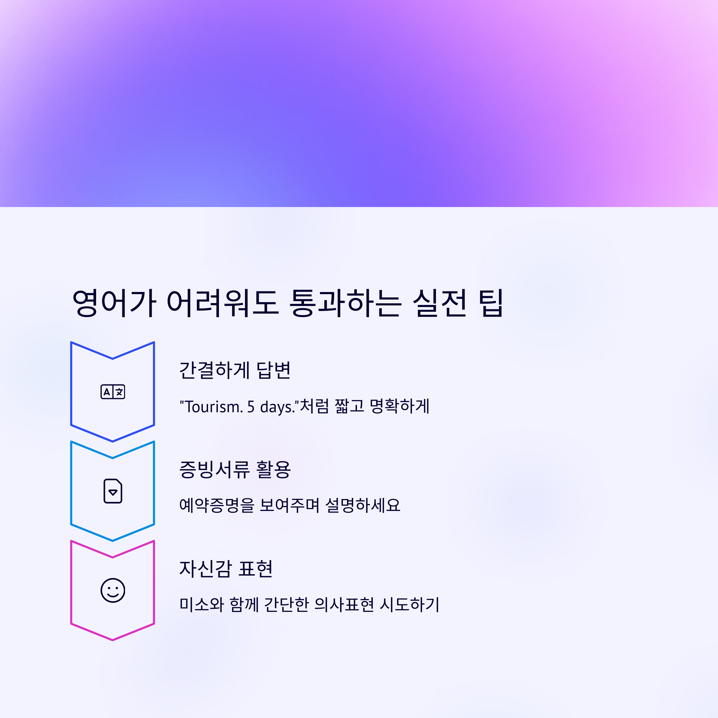 여권, 항공권, 숙소 예약 확인서 등 필수 | 목적, 체류 기간, 현지 연락처 등 | 자신감 있게 답변, 미소 유지 |