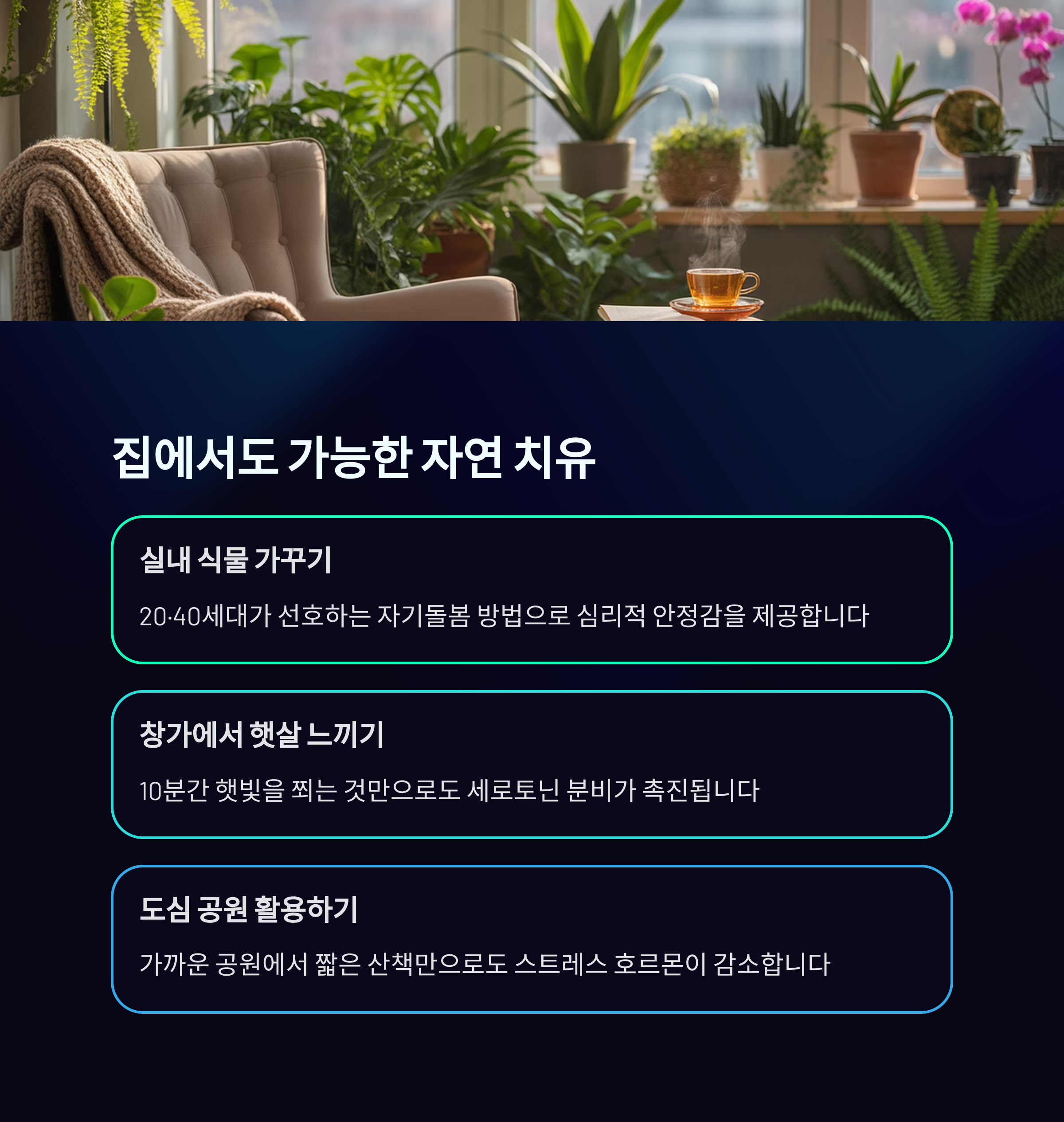 자연 활용법 산책, 명상, 정원 가꾸기 등 일상 속 자연 접촉입니다.