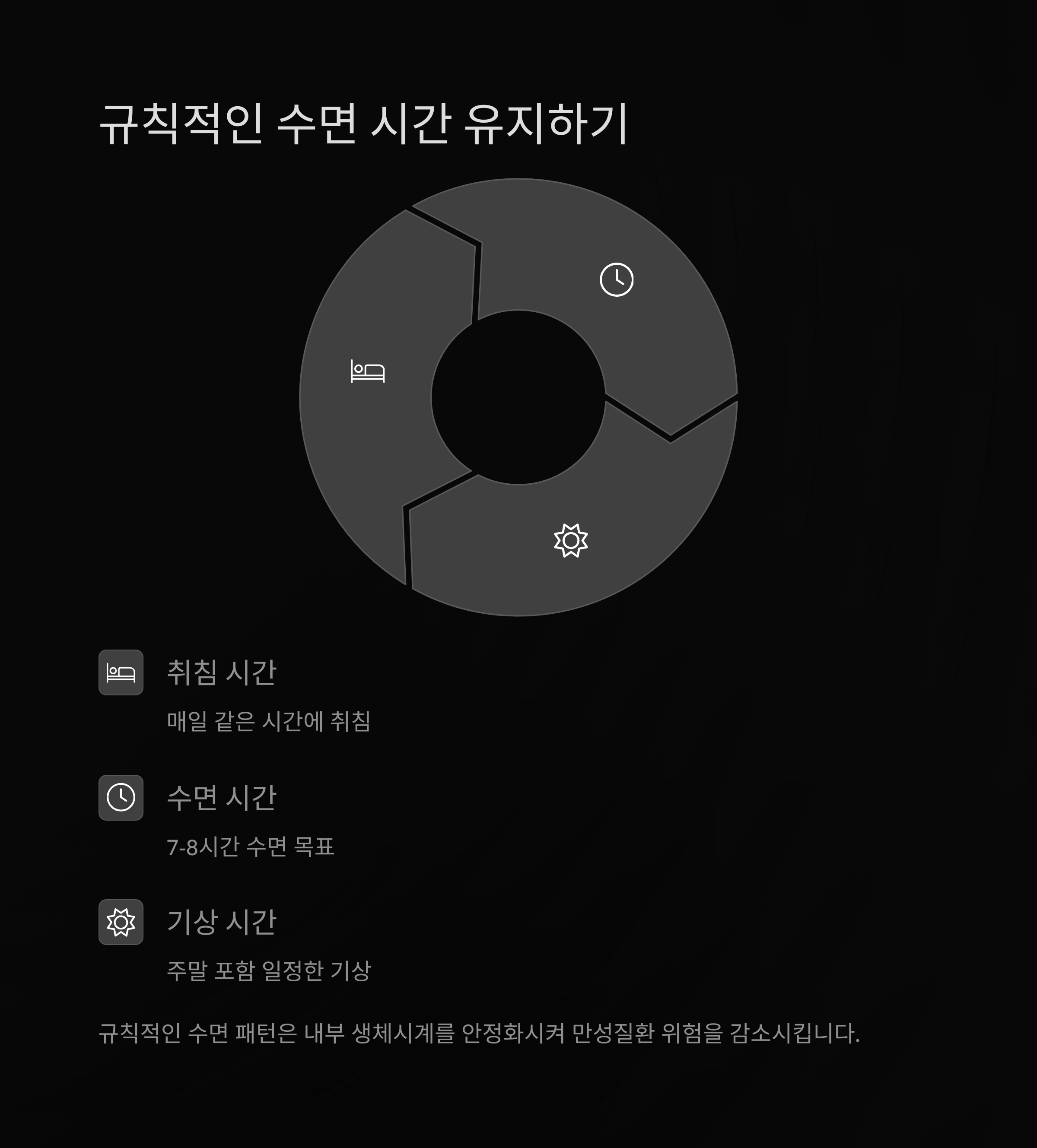 수면 루틴 | 매일 같은 시간에 자고 일어나는 습관입니다. |