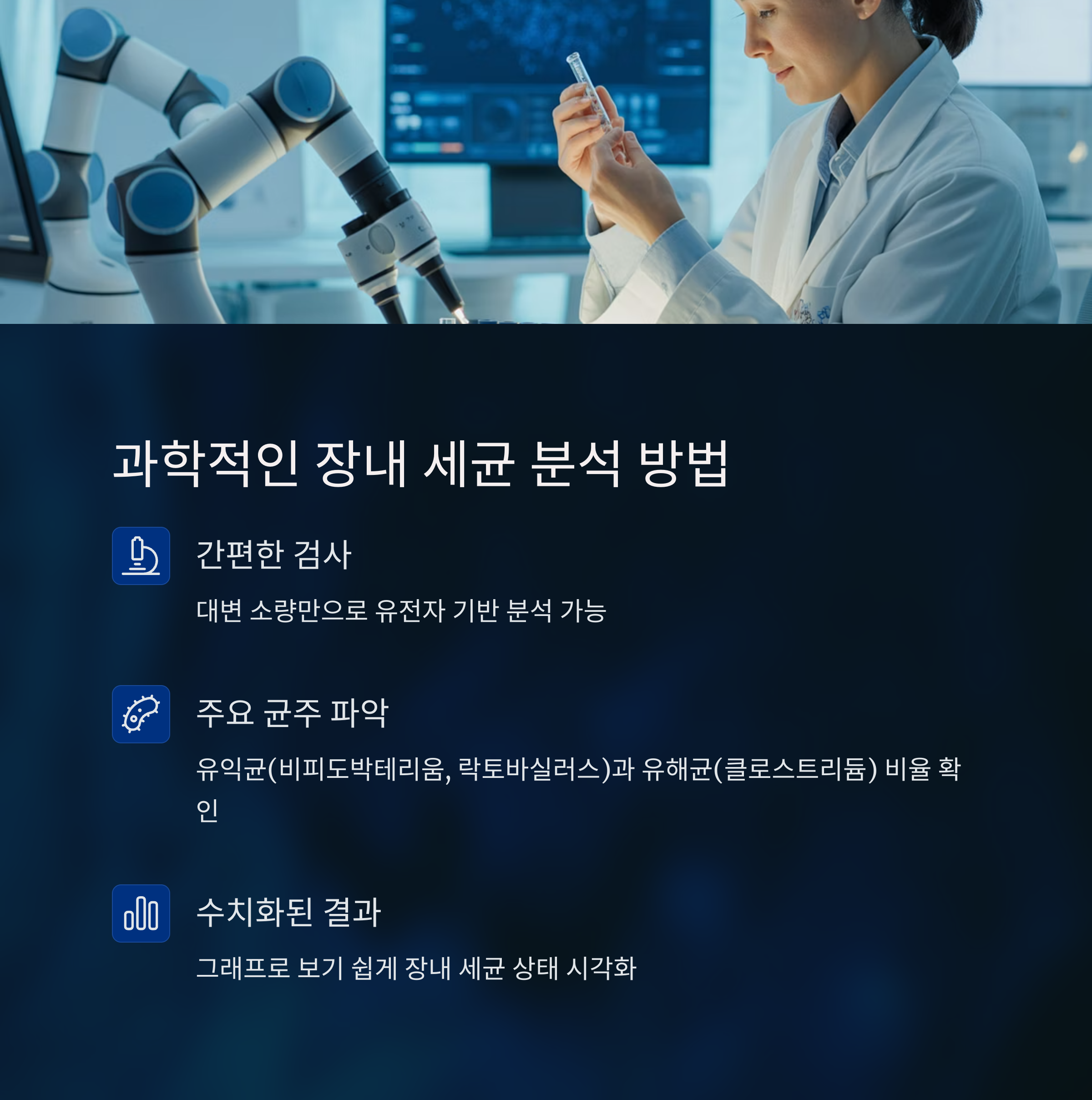 | 유전자 키트를 통해 간편하게 진행 가능 | 세균 분포에 따라 음식 조절 | 유익균과 유해균의 균형 맞추기 |