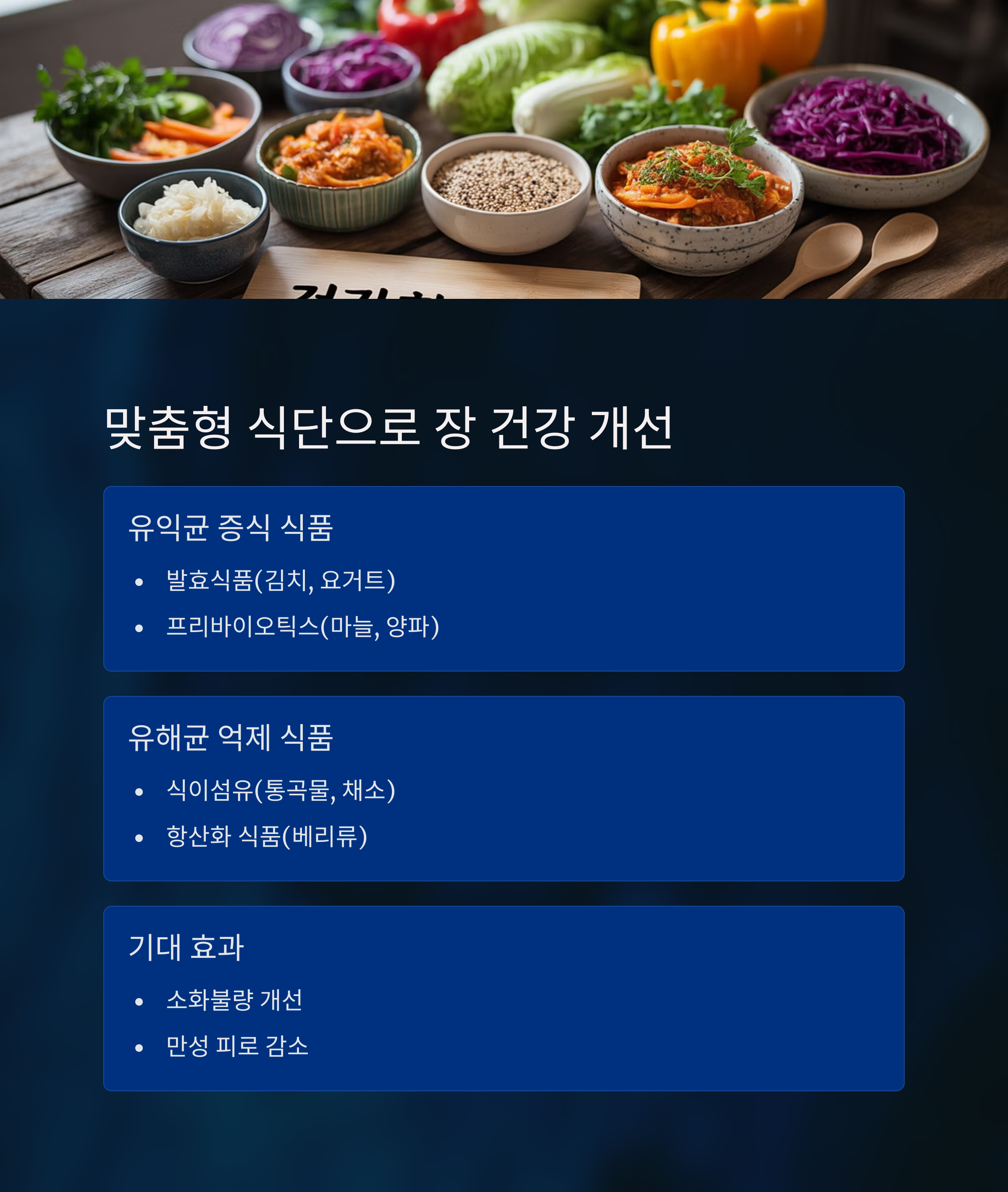 | 장내 세균 검사 | 맞춤형 식단 | 장 건강 관리 |