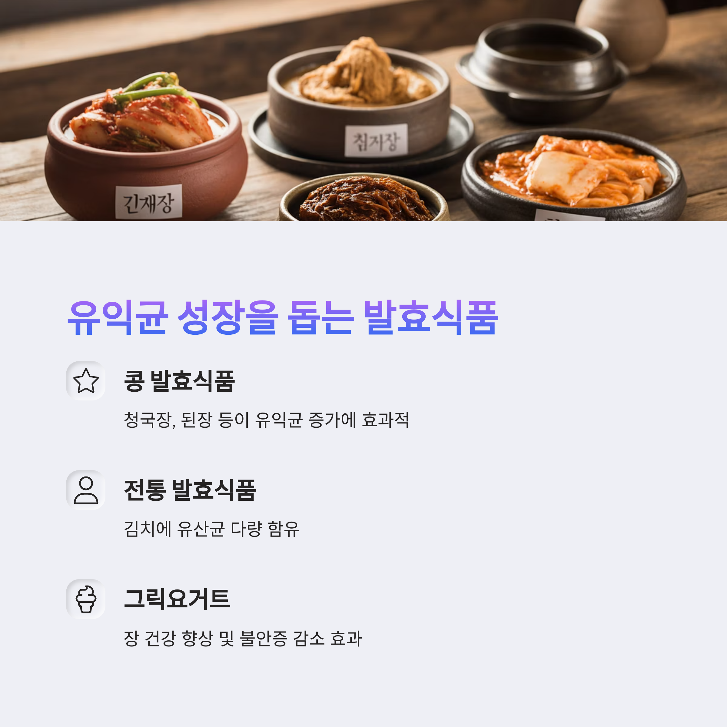 발효식품은 유익균 공급에 큰 도움이 되지만 식이섬유나 비타민이 함께 들어간 식단과 병행해야 효과가 극대화됩니다. 균형 잡힌 식사가 핵심입니다.