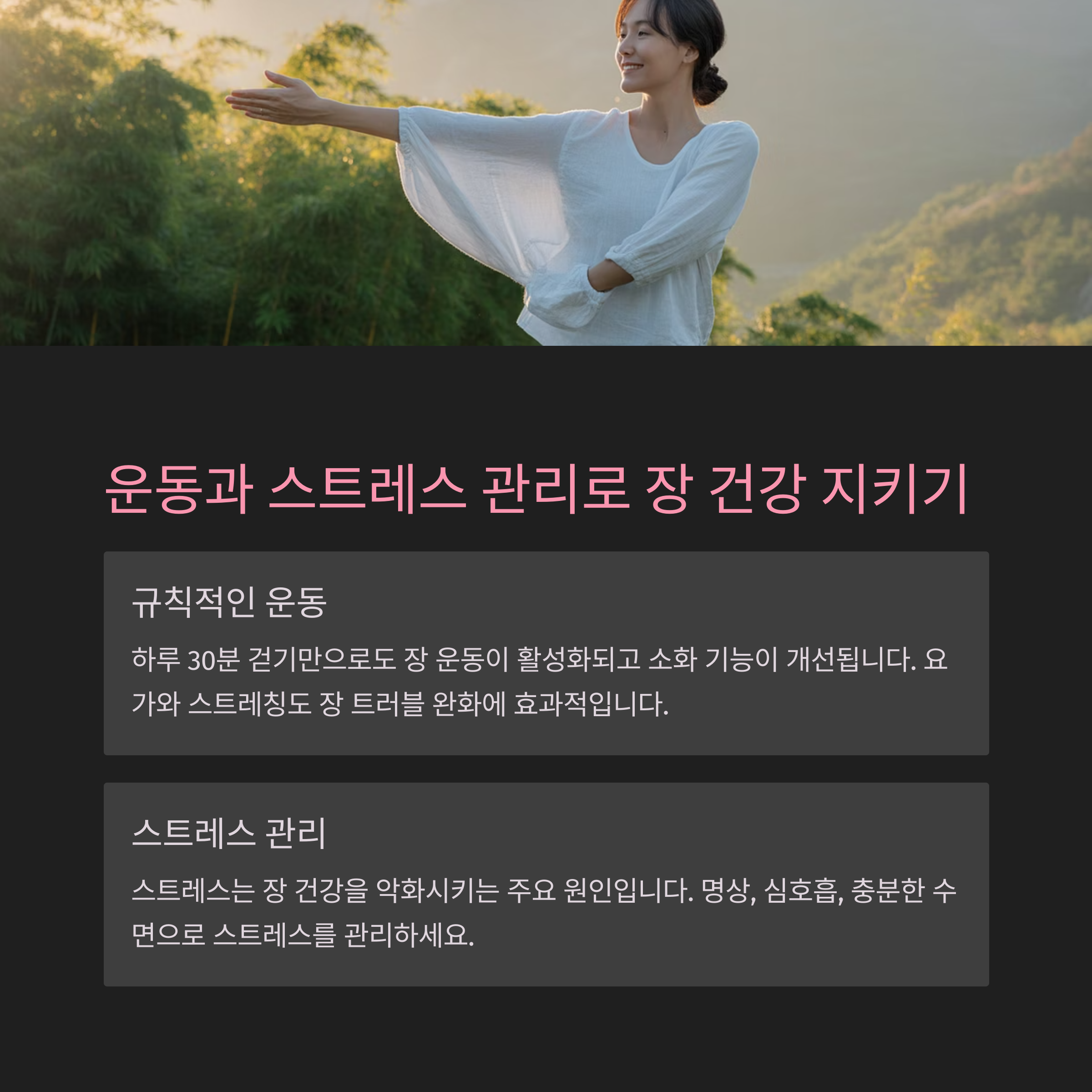마지막으로 운동과 수면도 빼놓을 수 없습니다. 가벼운 걷기나 스트레칭은 장의 연동 운동을 촉진시켜주고 규칙적인 수면 습관은 신체 리듬을 안정화시켜 장 기능 회복에 큰 역할을 합니다. 바쁜 일상 속에서도 하루 20~30분 정도의 산책 시간을 만들고, 밤 11시 이전에 잠자리에 드는 습관을 가져보세요. 몸이 편안해지면 자연스럽게 속 편안함도 함께 따라오게 됩니다. 장 트러블을 완화하고 싶은 분이라면 식습관뿐만 아니라 생활 습관 전반을 점검해보는 것이 중요합니다.