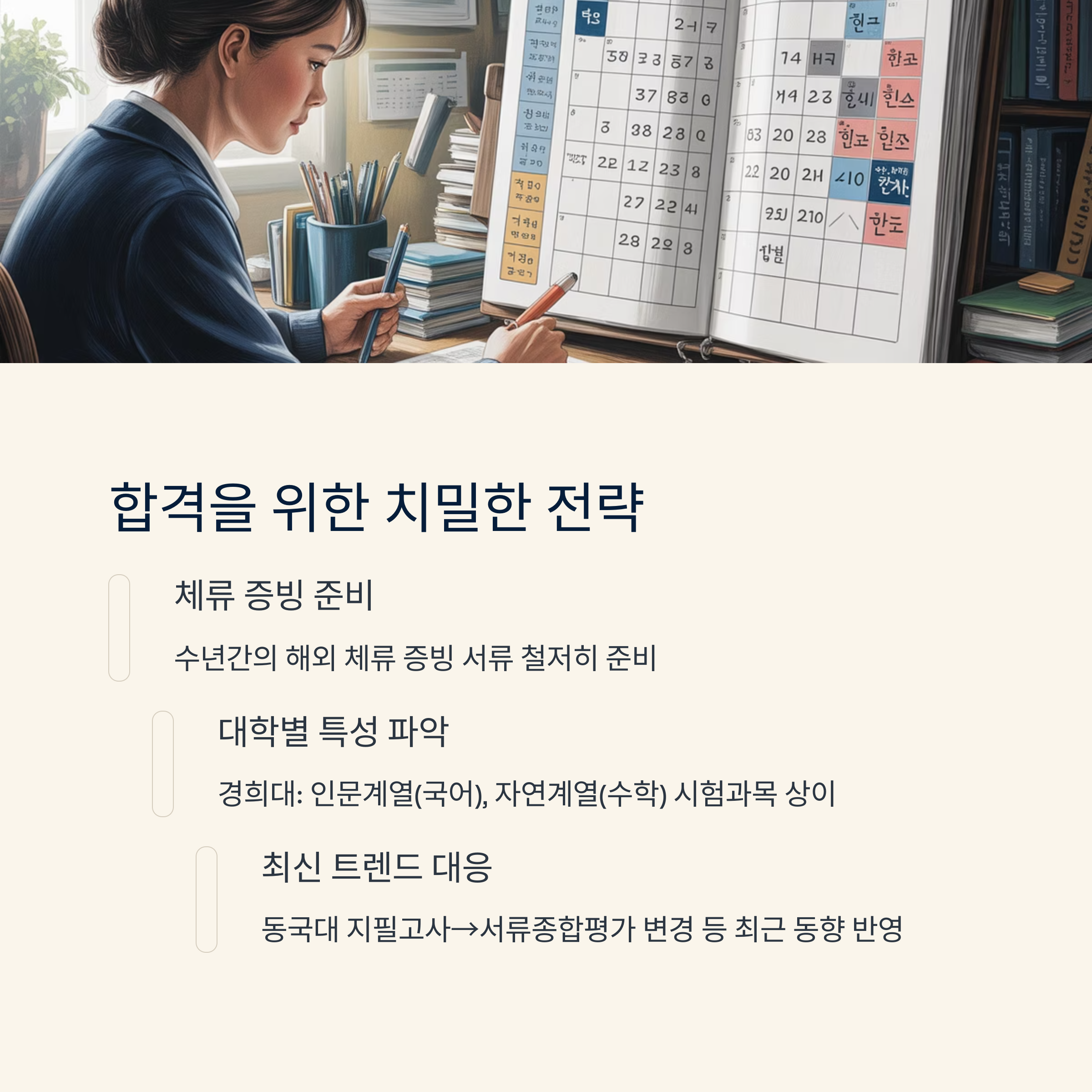 재외국민특별전형이라는 이름은 특별해 보이지만, 그만큼 준비도 남다르게 요구됩니다. 단순히 숫자에 의존하지 말고, 각 전형의 구조를 정확히 이해하고 본인에게 맞는 전략을 세우는 것이 중요합니다. 성실한 준비와 꾸준한 정보 확인이 결국 좋은 결과로 이어집니다. 특히 해외 체류 이력뿐만 아니라 자소서, 추천서, 면접 등 전 과정에서 전문성과 진정성이 요구되므로 체계적인 관리와 전문가 도움도 함께 고려해보시길 바랍니다.