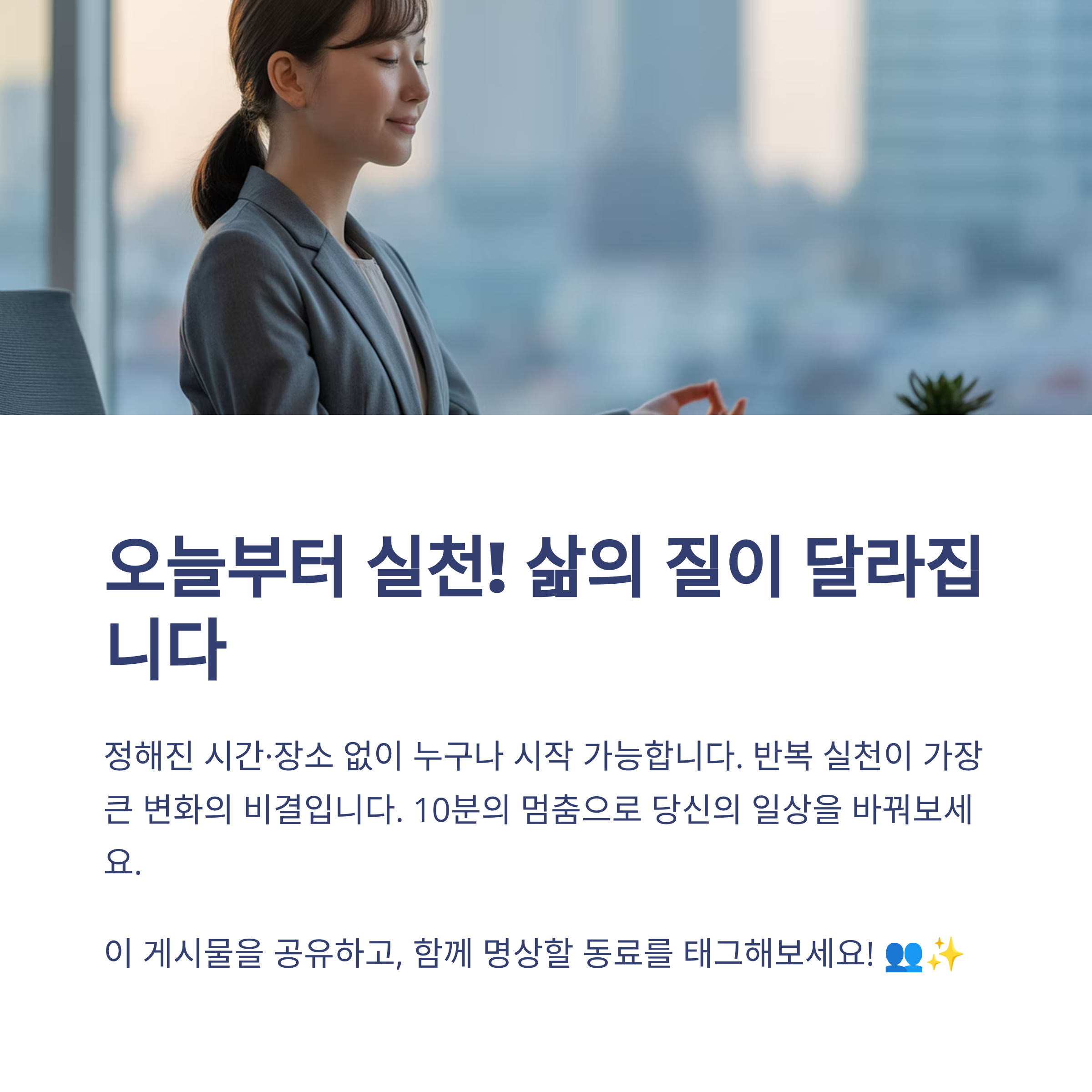 | 누구나 쉽게 실천할 수 있는 10분 명상 방법 | 출근 전, 점심시간 등 실천하기 좋은 시간대 | 짧은 시간 내 심리적 안정 찾기 |