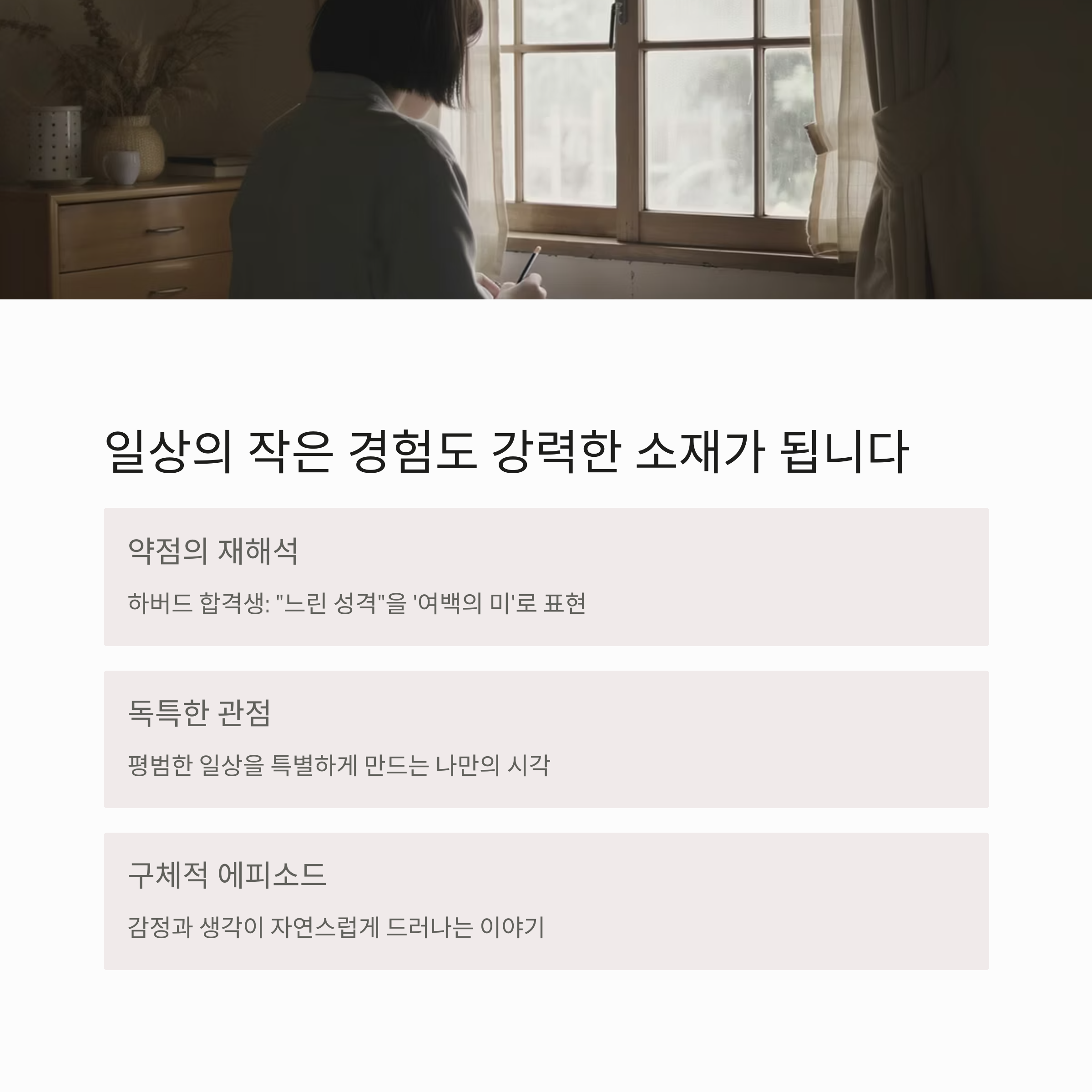 중요한 것은 남들과 다른 특별한 경험이 아니라, 나만의 시선으로 바라본 일상입니다. 주변에서 흔히 겪는 일이라도, 내가 그 일을 통해 무엇을 느끼고 어떤 가치를 얻었는지를 진솔하게 담아낸다면 그 자체가 훌륭한 에세이 소재가 됩니다. 독자는 그 글 속에서 인간적인 면모와 내면의 깊이를 보게 되고, 그것이 결국 합격을 이끄는 설득력 있는 글로 작용하게 되는 것입니다.